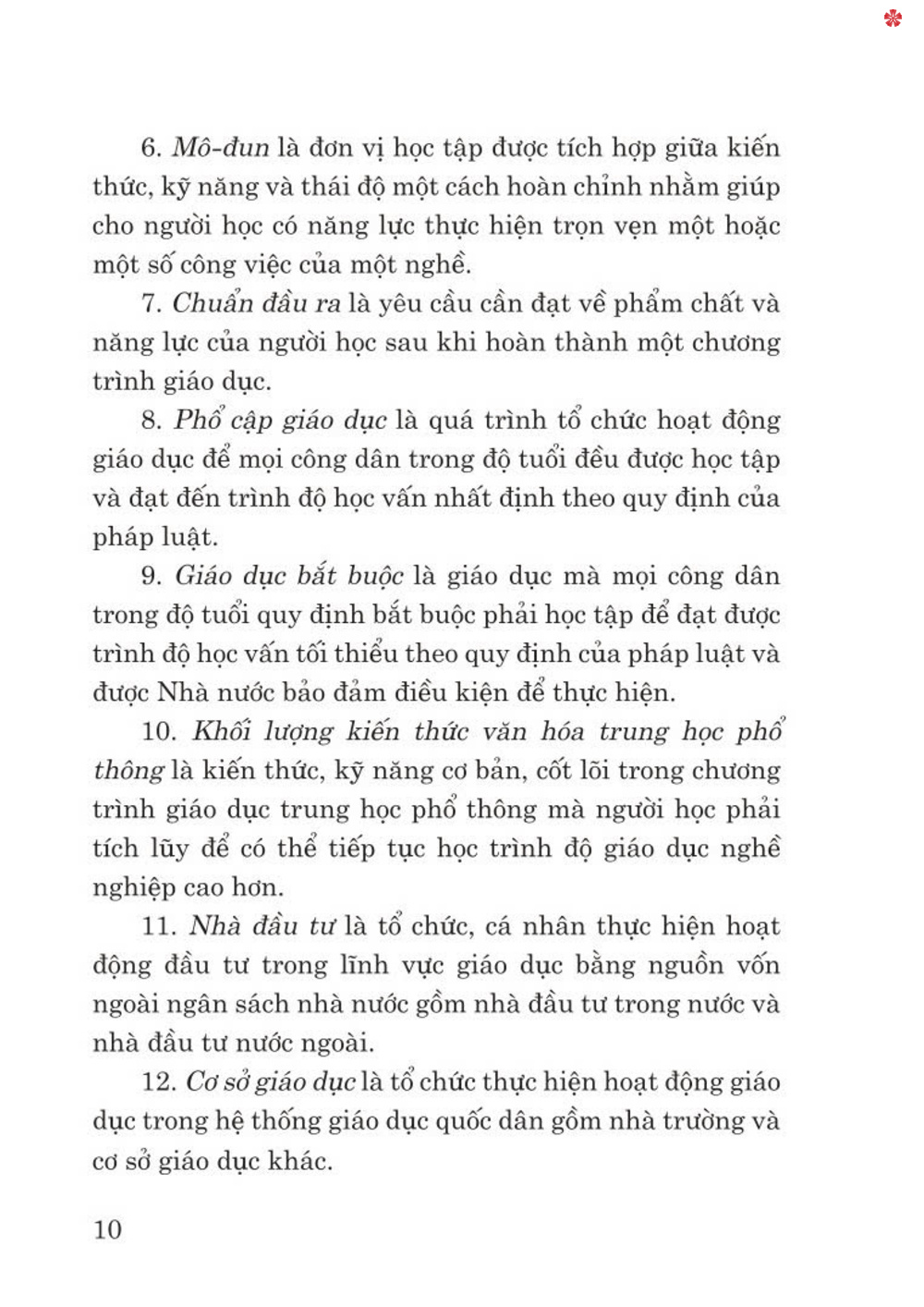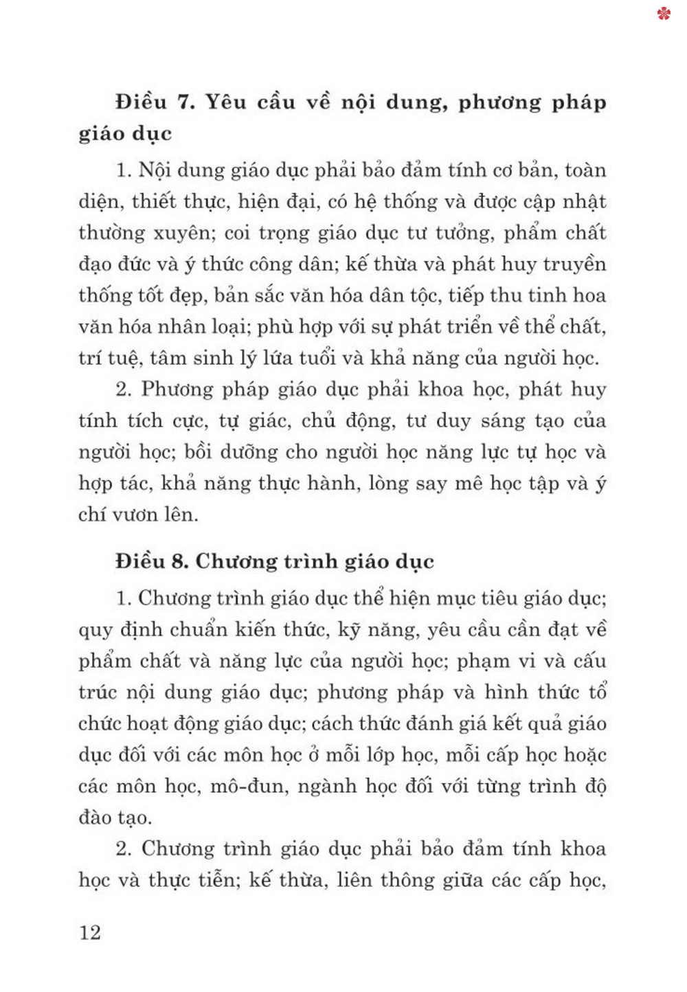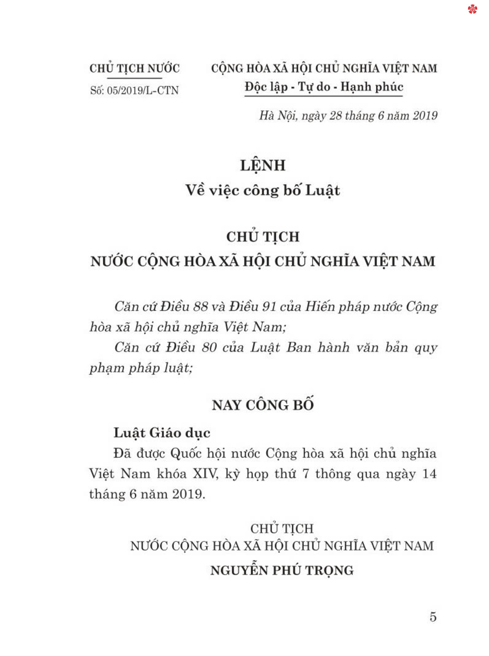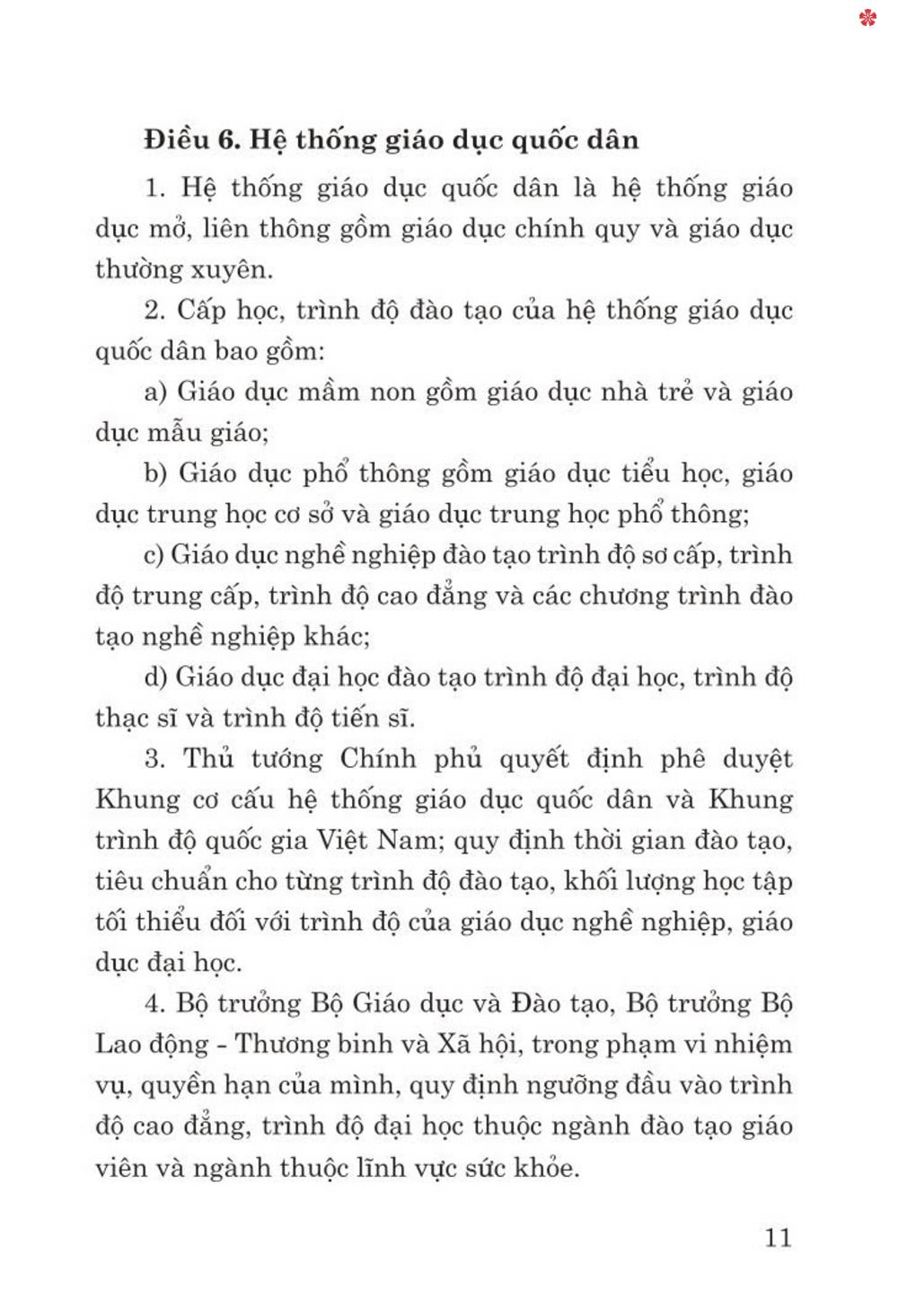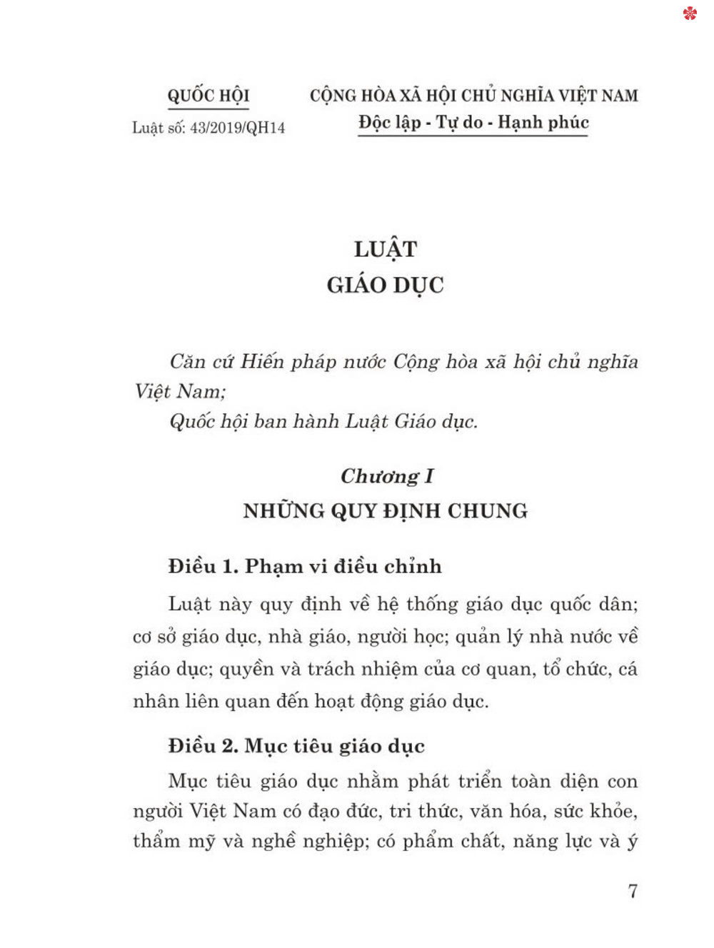 Mua tại TiktokLuật Giáo dục được Quốc hội nước Cộng hòa xã hội chủ nghĩa Việt Nam khóa XIV, kỳ họp thứ 7 thông qua ngày 14/6/2019, có hiệu lực từ ngày 01/7/2020. Luật gồm 9 chương, 115 điều, quy định về hệ thống giáo dục quốc dân; tổ chức, hoạt động, nhiệm vụ, quyền hạn của các cơ sở giáo dục; nhiệm vụ, quyền hạn, tiêu chuẩn, chính sách đối với nhà giáo, người học; quản lý nhà nước về giáo dục; trách nhiệm của cơ quan, tổ chức, cá nhân liên quan đến hoạt động giáo dục; đầu tư và tài chính trong giáo dục.