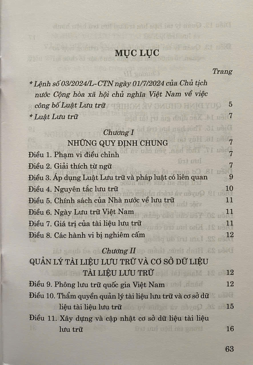 Luật Lưu Trữ số 33/2024/QH15 đã được Quốc Hội khoá XV thông qua ngày 21-06-2024. Luật gồm có 8 chương, 65 điều . Luật có hiệu lực áp dụng từ ngày 01-07-2025