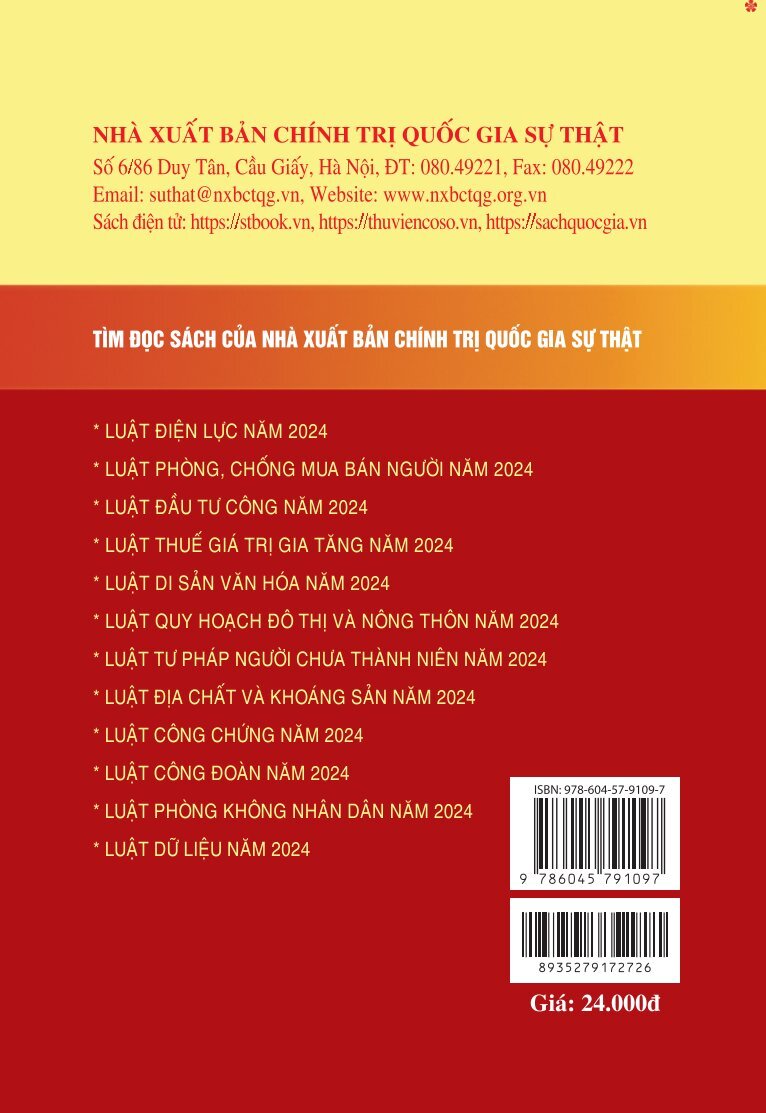 Luật phòng cháy, chữa cháy và cứu nạn, cứu hộ năm 2024 Năm XB 2025 Chịu trách nhiệm phát hành: NXB Chính trị quốc gia sự thật Khổ 13 x 19cm Số trang: 91