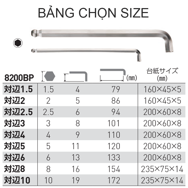 - Bộ lục giác thân dài đầu vặn cứng No.8209BP-L gồm 9 cái kích thước khác nhau, gồm: H1.5 ; 2 ; 2.5 ; 3 ; 4 ; 5 ; 6 ; 8 ; 10mm. -