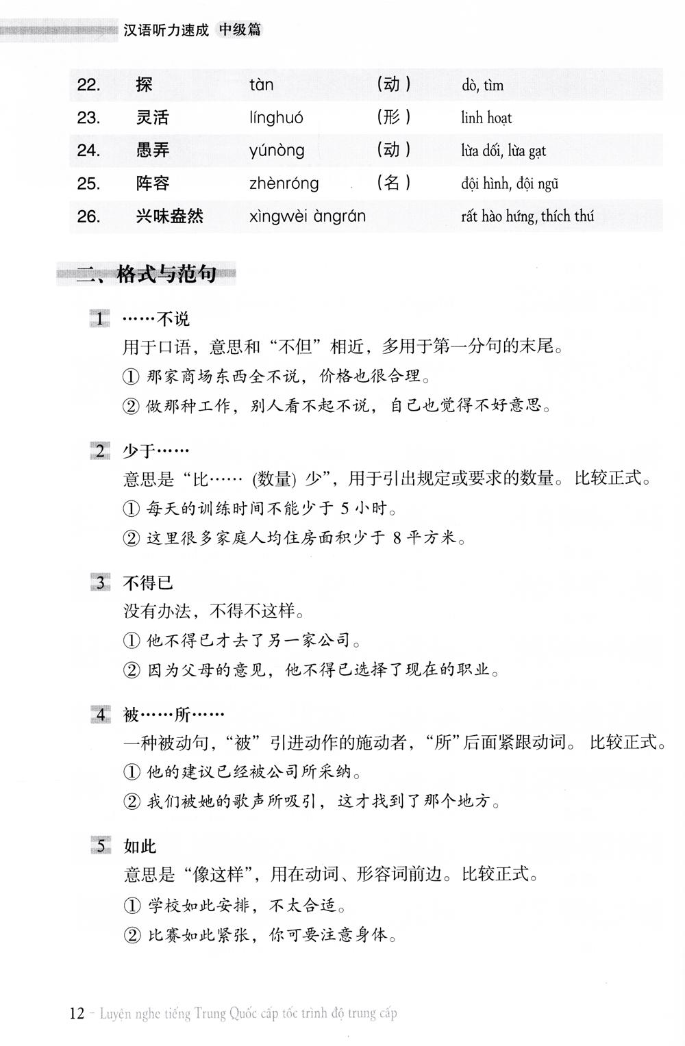 Luyện nghe tiếng Trung Quốc cấp tốc là bộ giáo trình được biên soạn cho sinh viên nước ngoài đến du học ngắn hạn tại Trung Quốc với mục đích giúp sinh viên bồi dưỡng kỹ năng giao tiếp. Toàn bộ giáo trình gồm 5 trình độ, được chia làm 3 cấp (sơ cấp, trung cấp và nâng cao), trong đó mỗi quyển tương ứng với một trình độ của sinh viên nước ngoài có nhu cầu học cấp tốc.