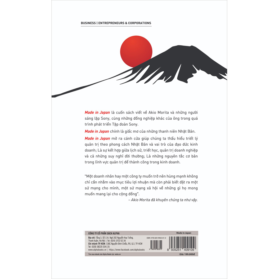 Made in Japan - Akio Morita là cuốn sách do chính Akio Morita viết về ông và những người sáng lập Sony, cùng những đồng nghiệp khác trong quá trình phát triển tập đoàn Sony. Made in Japan chính là giấc mơ của những chàng thanh niên Nhật Bản trẻ tuổi. Đây là cuốn sách mở ra cánh cửa giúp chúng ta thấu hiểu triết lý quản trị theo phong cách Nhật Bản và vai trò của đạo đức kinh doanh.