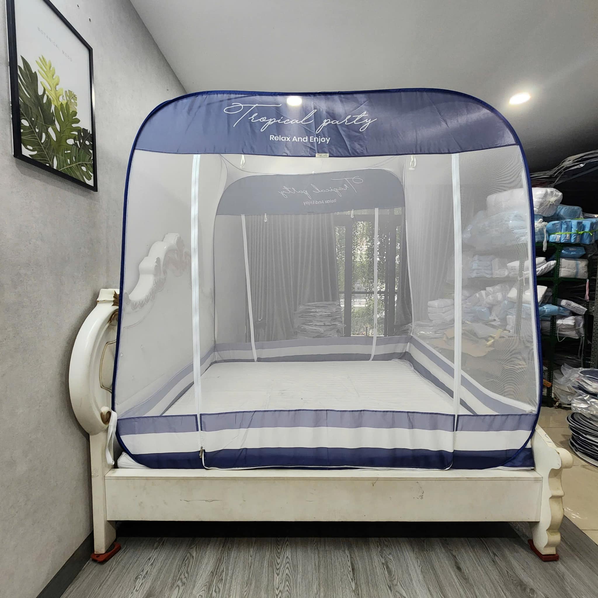 Kiểu dáng: Đỉnh rộng, có 2 cửa ra vào, có viền chân là từ vải nylon thay vì lưới mùng ( giúp bảo vệ 100% khi để tay chân chạm sát mùng)
