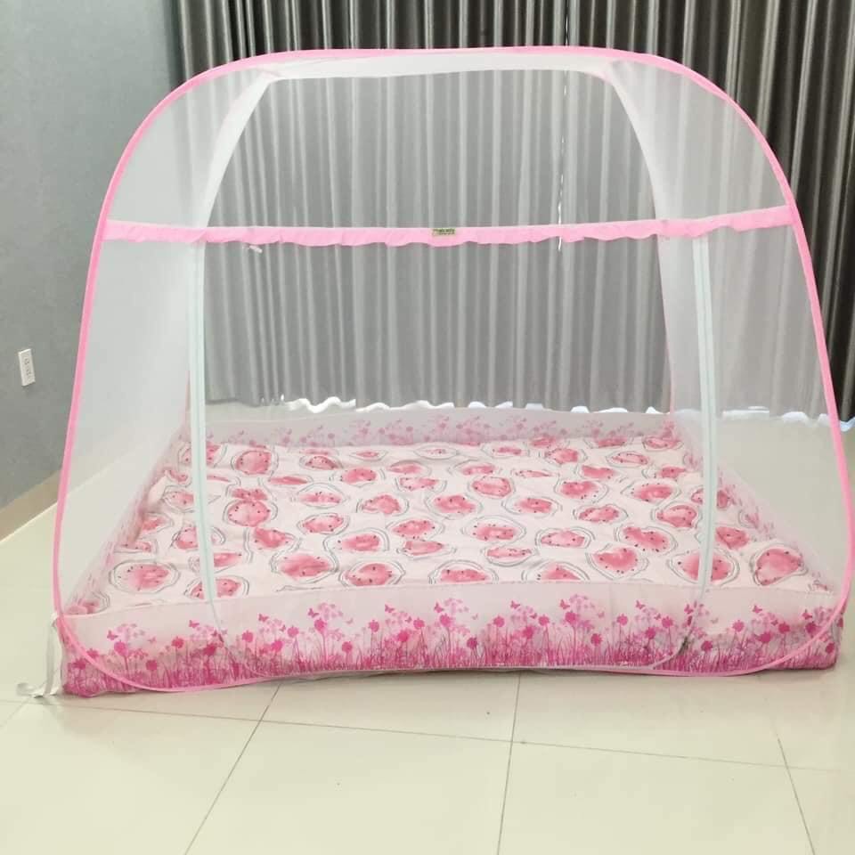 MÀN CHỤP , MÙNG CHỤP CAO CẤP MỘC MIÊN ĐỈNH RỘNG : Màn chụp tự bung cao cấp Mộc Miên đỉnh rộng trắng viền hồng loại 1,6m x2m - 3 cửa :  Xuất xứ :