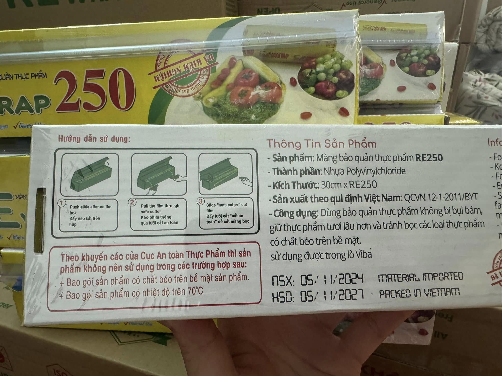 Được làm từ nhựa PVC, dùng để bảo quản thực phẩm tươi ngon, tránh nhiễm vi khuẩn, an toàn vệ sinh. Màng bọc có thể chịu nhiệt độ - 60°C đến 130°C. Sản xuất tại