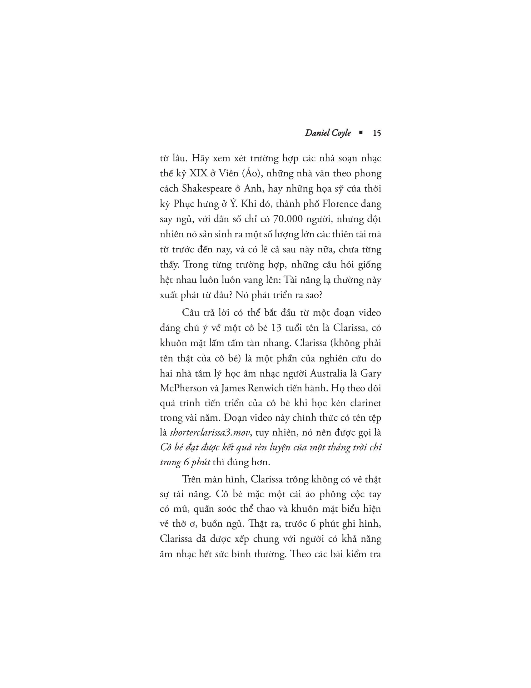 Mật Mã Tài Năng Bí mật của tài năng là gì? Chúng ta có thể khám phá nó ra sao? Trong cuốn sách đi sâu nghiên cứu này, nhà báo – tác giả có sách bán chạy nhất theo bình chọn của Thời báo New York – Daniel Coyle sẽ cung cấp cho các bậc phụ huynh, giáo viên, huấn luyện viên, doanh nhân – và mọi người khác nữa – các công cụ để có thể tận dụng tối đa các tiềm năng của chính bản thân và mọi người. Dù bạn đang huấn luyện cho một đội bòng bầu dục hay dạy một đứa trẻ chơi đàn piano, viết tiểu thuyết hay cố gắng cải thiện cú vung gậy trong môn bóng chày thì cuốn sách mang tính cách mạng này sẽ chỉ cho bạn biết cách nuôi dưỡng và phát triển tài năng thông qua việc khai thác và sử dụng một cơ chế mới được khám phá của não bộ. Dựa trên những thành tựu xuất sắc của ngành thần kinh học và nghiên cứu mới nhất trong quá trình đi tới 9 địa chỉ sản sinh ra rất nhiều tài năng của thế giới – từ sân bóng chày ở vùng Ca-ri-bê đến học viện âm nhạc cổ điển phía bắc New York – Coyle đã chỉ ra 3 yếu tố then chốt cho phép bạn phát triển tài năng và tối ưu hóa khả năng của m.ình trong các lĩnh vực thể thao, nghệ thuật, âm nhạc, toán học hay bất kỳ điều gì khác. +Tác giả: Daniel Coyle là tác giả của hai cuốn sách bán chạy nhất do Thời báo New York bình chọn, Cuộc chiến của Lance Armstrong và Bóng chày: Một mùa nằm trong dự án. Ông còn là biên tập viên góp ý cho Tạp chí Outside. Ông sống cùng vợ và 4 con tại Homer, bang Alaska. Đây cũng là nơi ông huấn luyện cho một đội bóng đang tiến bộ rất nhanh, Little League.