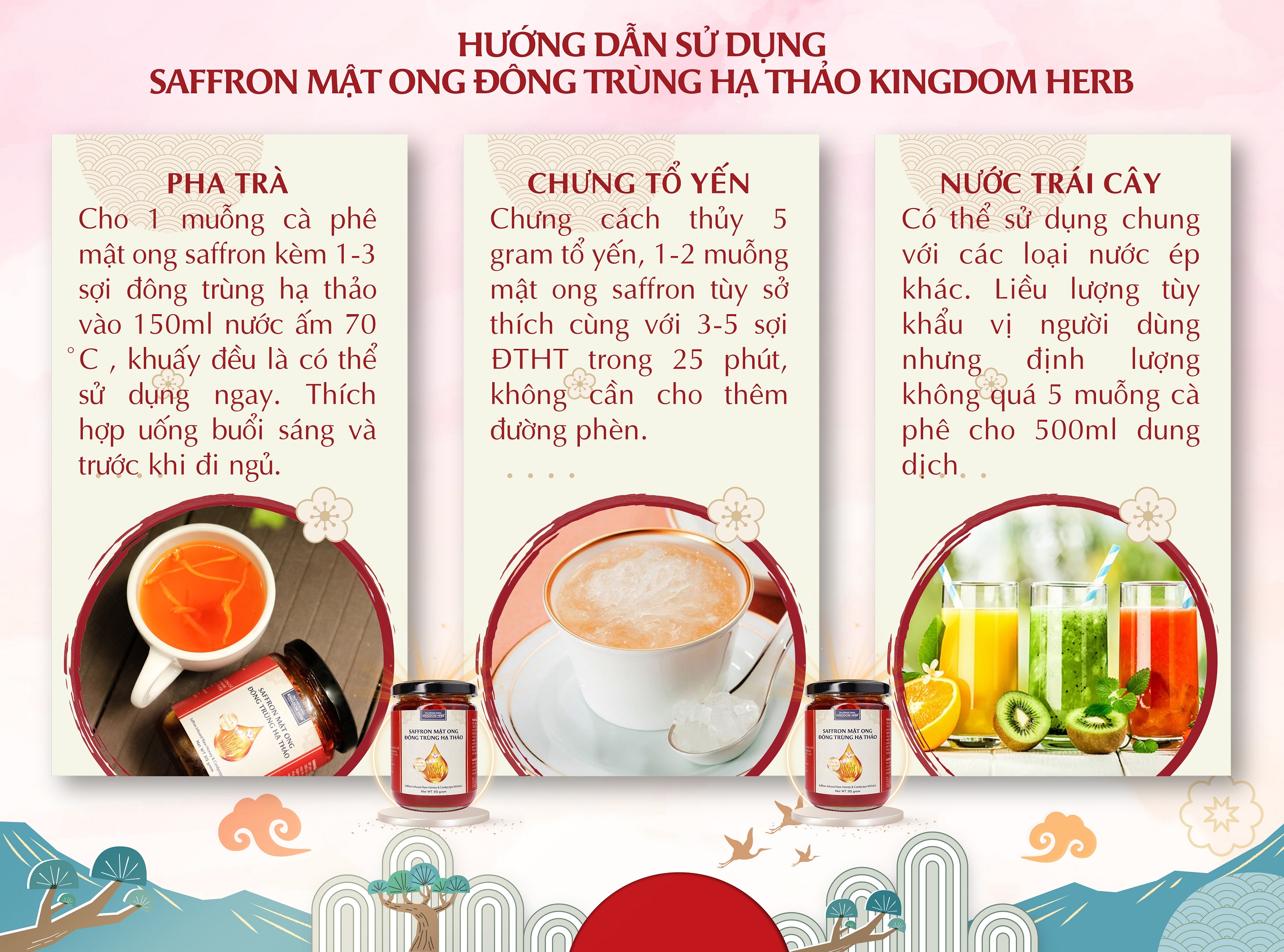 Cách dùng saffron ngâm mật ong đông trùng hạ thảo Kingdom Herb (xem chi tiết hình ảnh trong album):