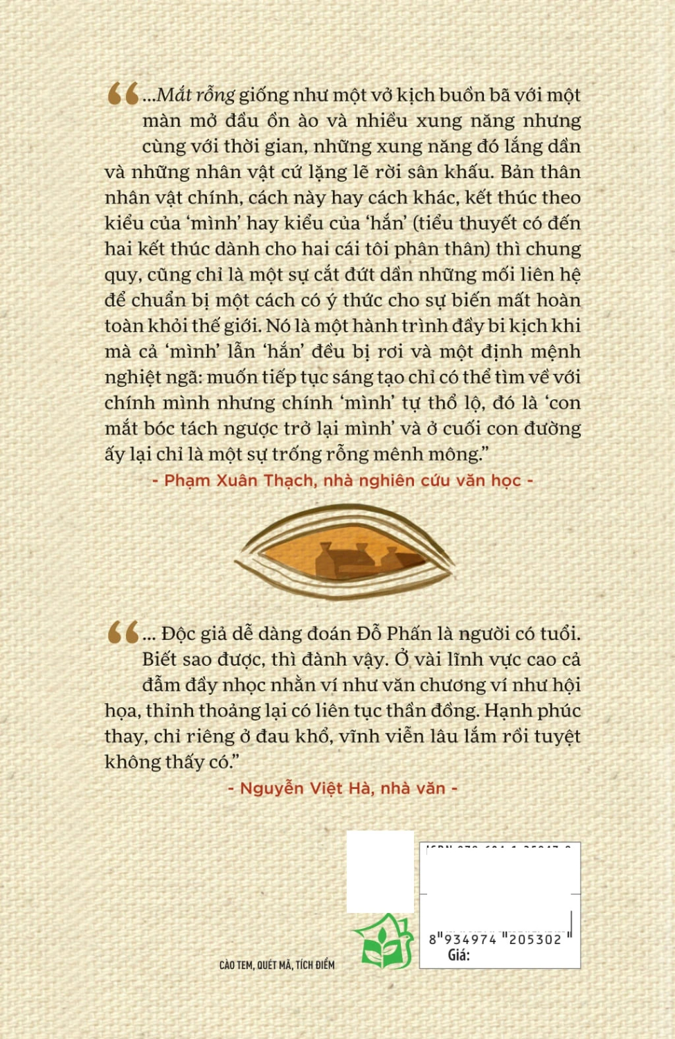 Mắt rỗng lấy bối cảnh phố với nhiều biến đổi gấp gáp của một đời sống đi thị chạng vạng, nhập nhòe. Nhân vật chính phân thân làm hai nửa, một hành động mang danh “gã”, một phán xét tự nhận “mình”.
