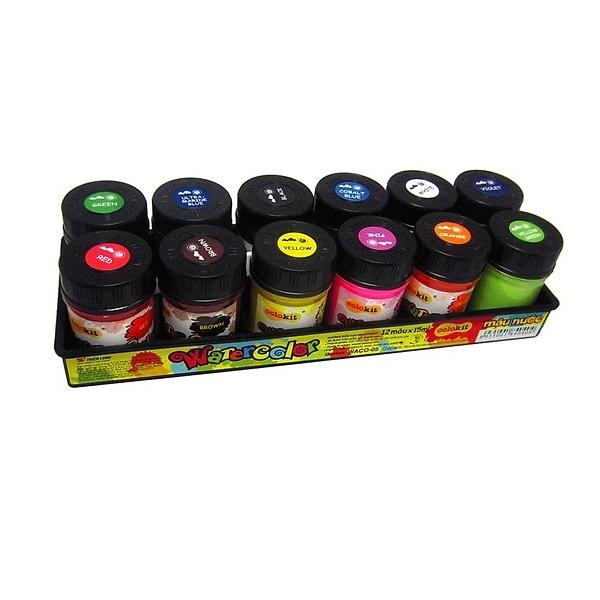 Màu Nước TL WACO-05 (12 Màu) Dạng màu nước được đựng trong lọ nhựa dung tích 15ml trong suốt nhận diện được màu bên trong và tem nhận diện màu trên nắp lọ. Có roan