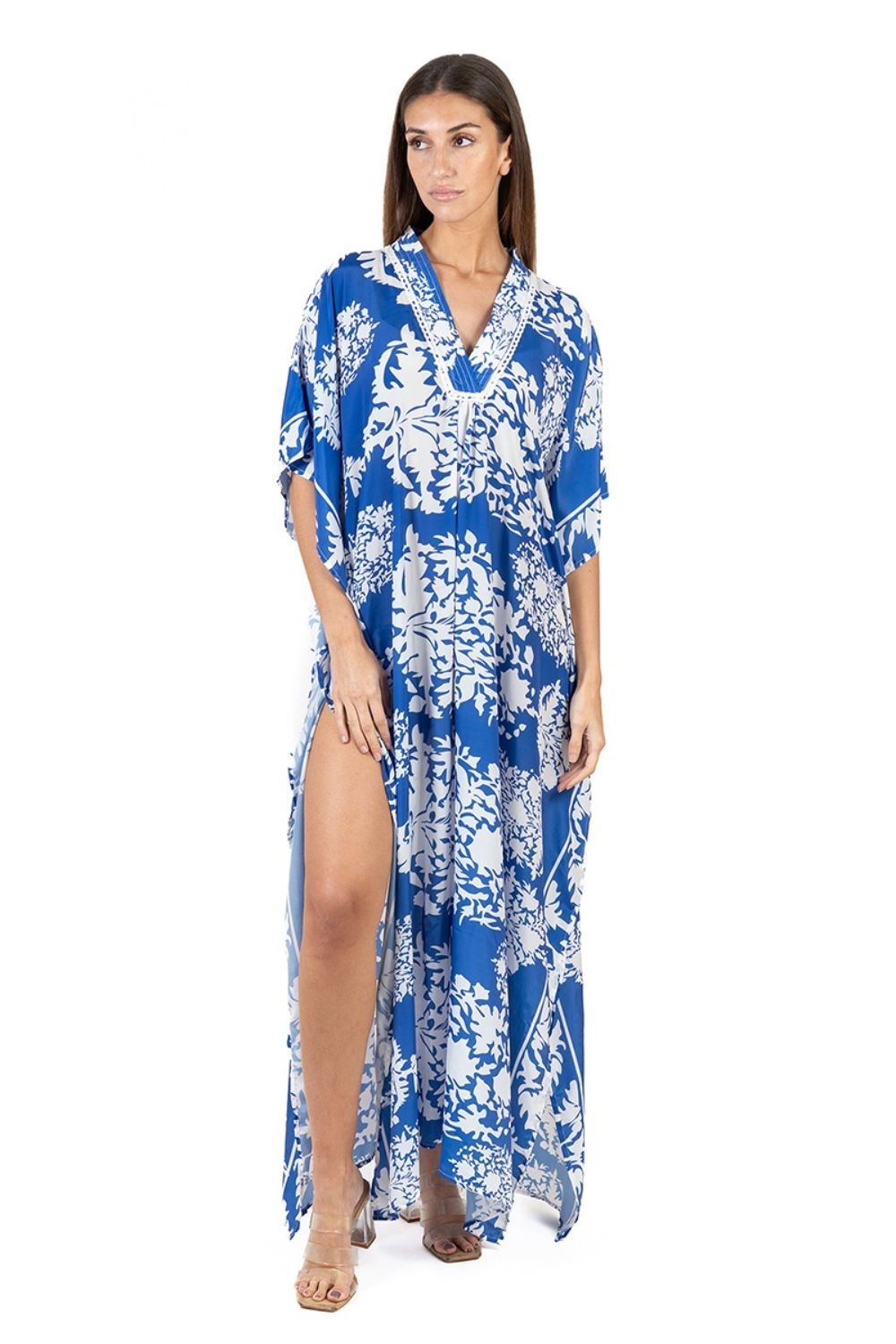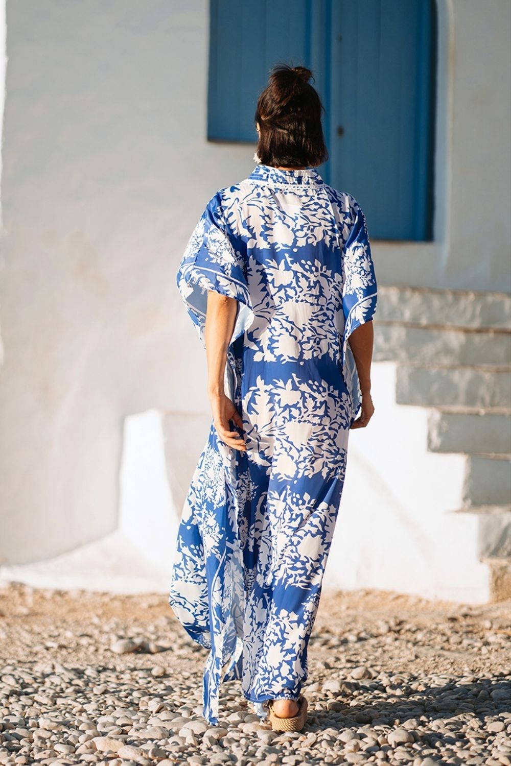 Maxi Cánh Dơi Hoa Cotton Isla Bonita, chất liệu lụa cao cấp, mềm mại, thoáng mát. Xẻ tà 2 bên. Hoa xanh nổi bật trên nền vải trắng. Đầm cánh dơi, phom rộng freestyle. Dài