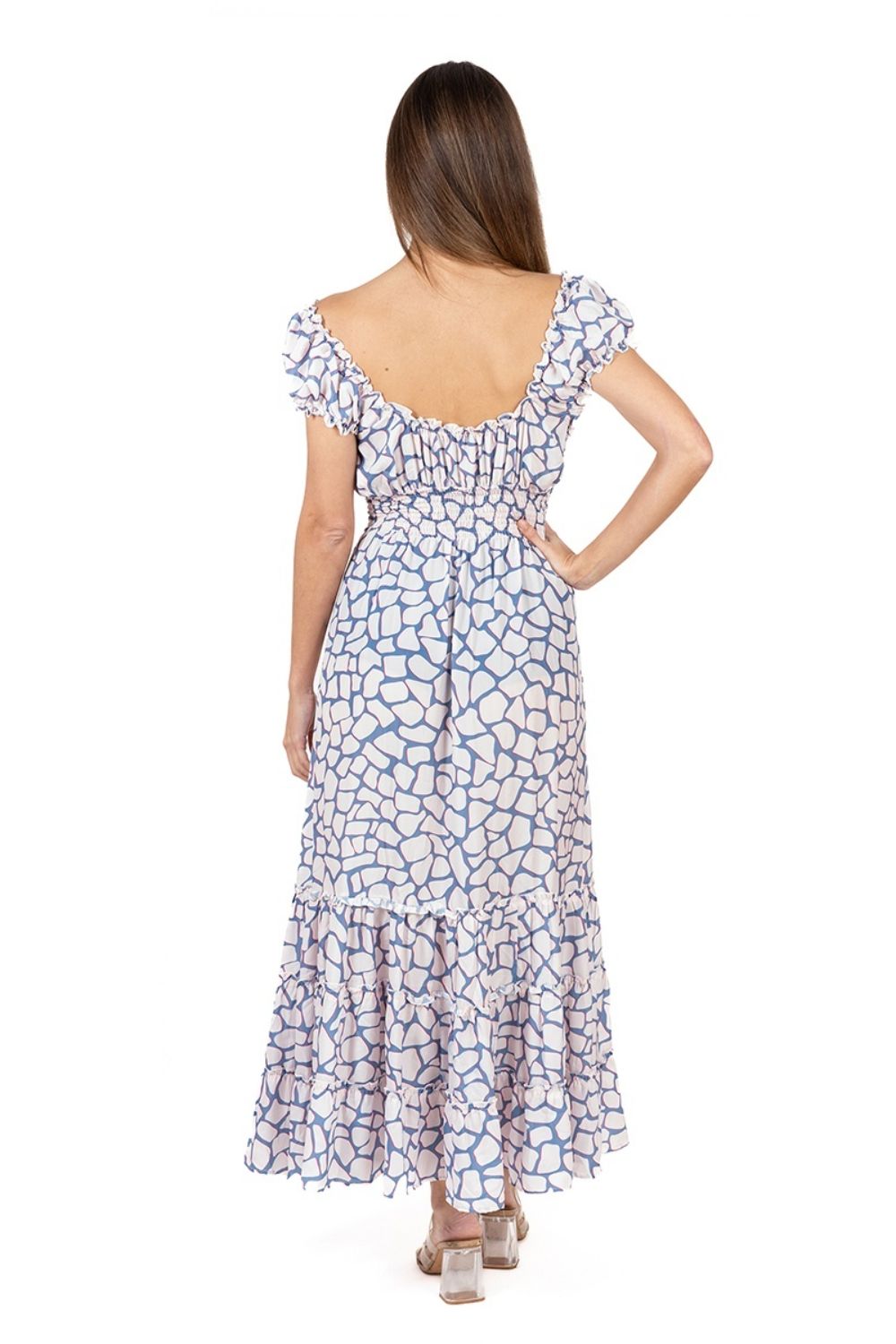 Maxi Cổ V Cotton Isla Bonita, chất liệu lụa mềm mại, cao cấp, nền vải trắng trang nhã họa tiết xanh tinh tế. Có thể mặc cổ V hoặc kéo thành trễ vai. Eo thun
