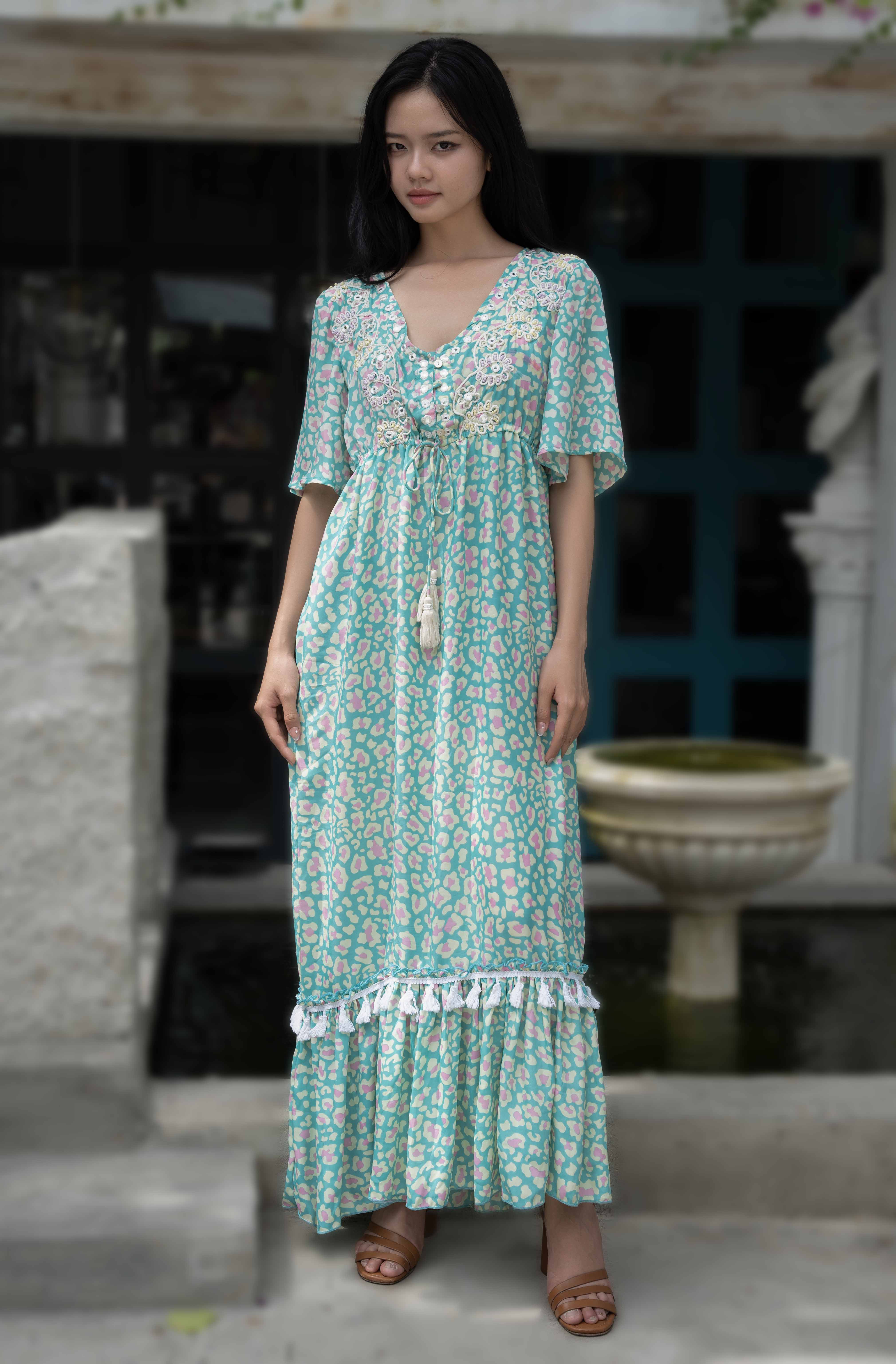 Maxi Cotton Cao Cấp Luna Llena, nền vải Lazer Cut độc đáo, tạo lỗ như ren, sang trọng, chất cotton dày dặn, thân trước đắp chéo, có thể tăng giảm eo. Lớp lót cao cấp.