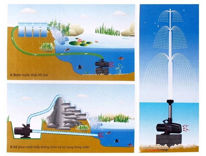 - Máy bơm đáng tin cậy và hiệu quả dùng để bơm nước, cấp nước cho các bộ lọc, ao cá, hồ cá, thác nước hoặc đài phun nước.