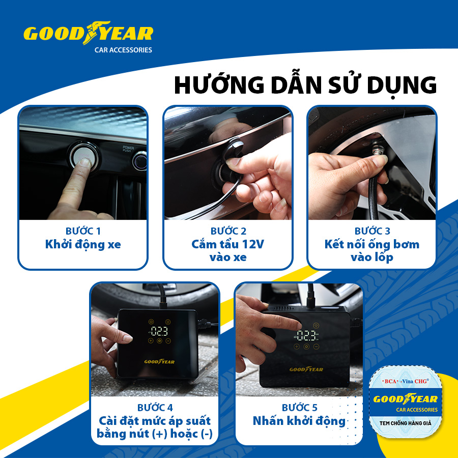 SHOP CIND XIN CHÀO QUÝ KHÁCH, CẢM ƠN QUÝ KHÁCH ĐÃ QUAN TÂM SẢN PHẨM CỦA SHOP CIND MÔ TẢ SẢN PHẨM Máy Bơm Lốp Xe GOODYEAR GY-5218 Cảm Ứng Đa Điểm Tự Ngắt Thông Minh Đặc điểm nổi bật: Máy bơm hơi chính hãng thương hiệu nổi tiếng Goodyear Màn hình hiển thị cảm ứng đa điểm, phím cảm ứng cực nhạy, giúp người dùng dễ dàng thao tác Mặt trên của bơm phủ bằng lớp kính cường lực, chắc chắn, không bám bụi, dễ vệ sinh Kích thước nhỏ gọn nhẹ, có thể dễ dàng cất gọn trong cốp xe hay dưới gầm ghế xe, được trang bị túi vải đựng chuyên dụng Dây dẫn khí được bọc Kevlar chịu được áp lực lớn, có chiều dài 62cm giúp người dùng dễ dàng thao tác ở những vị trí xa Tốc độ bơm cực nhanh, tự ngắt khi bơm đủ áp suất của lốp xe Với bốn chế độ cài đặt áp suất có thể lập trình trước, sẵn sàng bơm hơi lốp xe đạp, xe máy và ô tô cũng như một quả bóng thể thao hay phao hơi... Tích hợp đèn LED thuận tiện sử dụng trong không gian tối Sản phẩm có 2 đầu bơm khác nhau Thông số kỹ thuật: