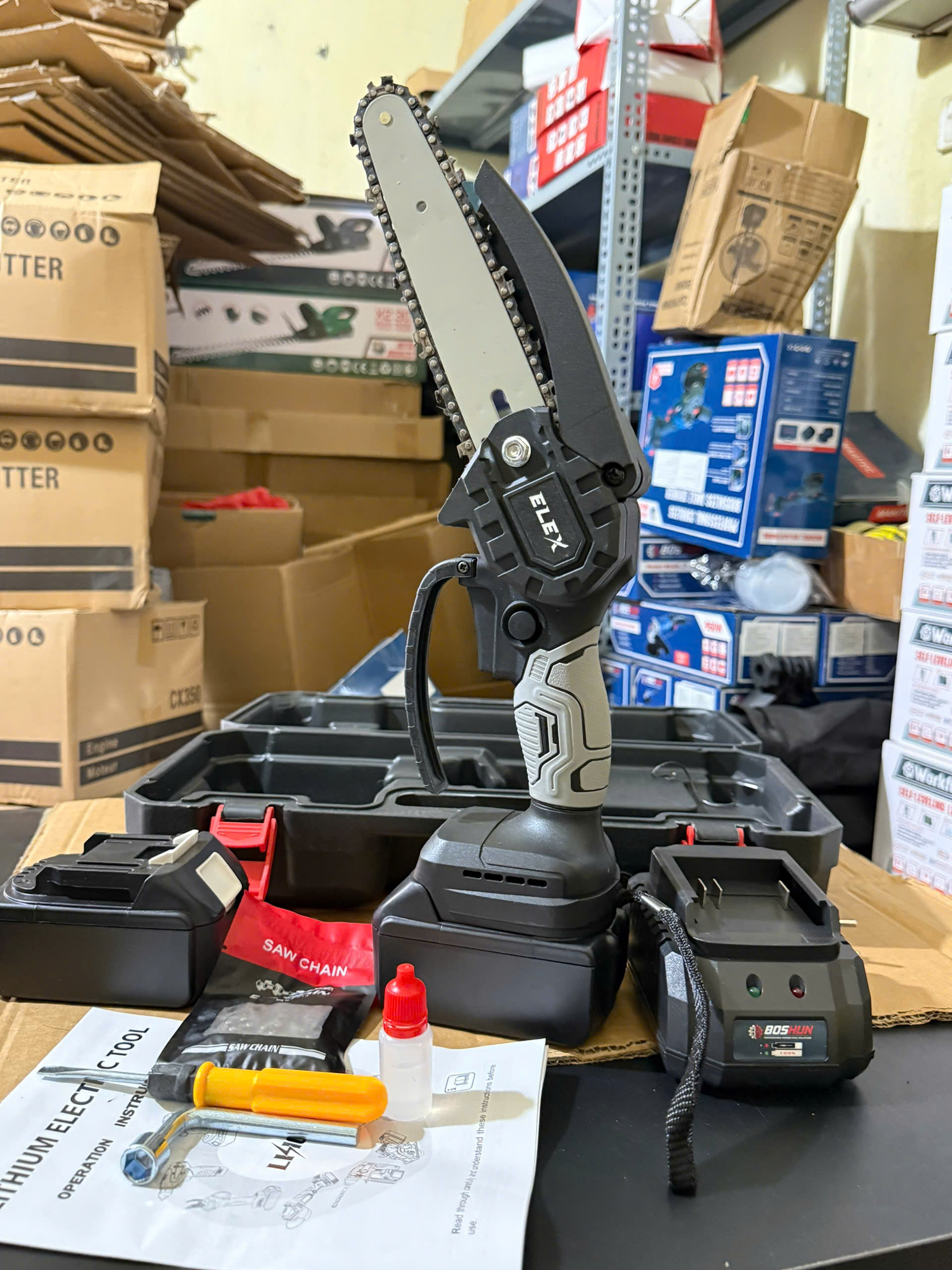 -Máy cưa xích pin cầm tay, cưa mini dùng pin BOSHUN 199V pin 10cell lam xích 6inch cưa gỗ siêu khỏe bảo hành 12 tháng