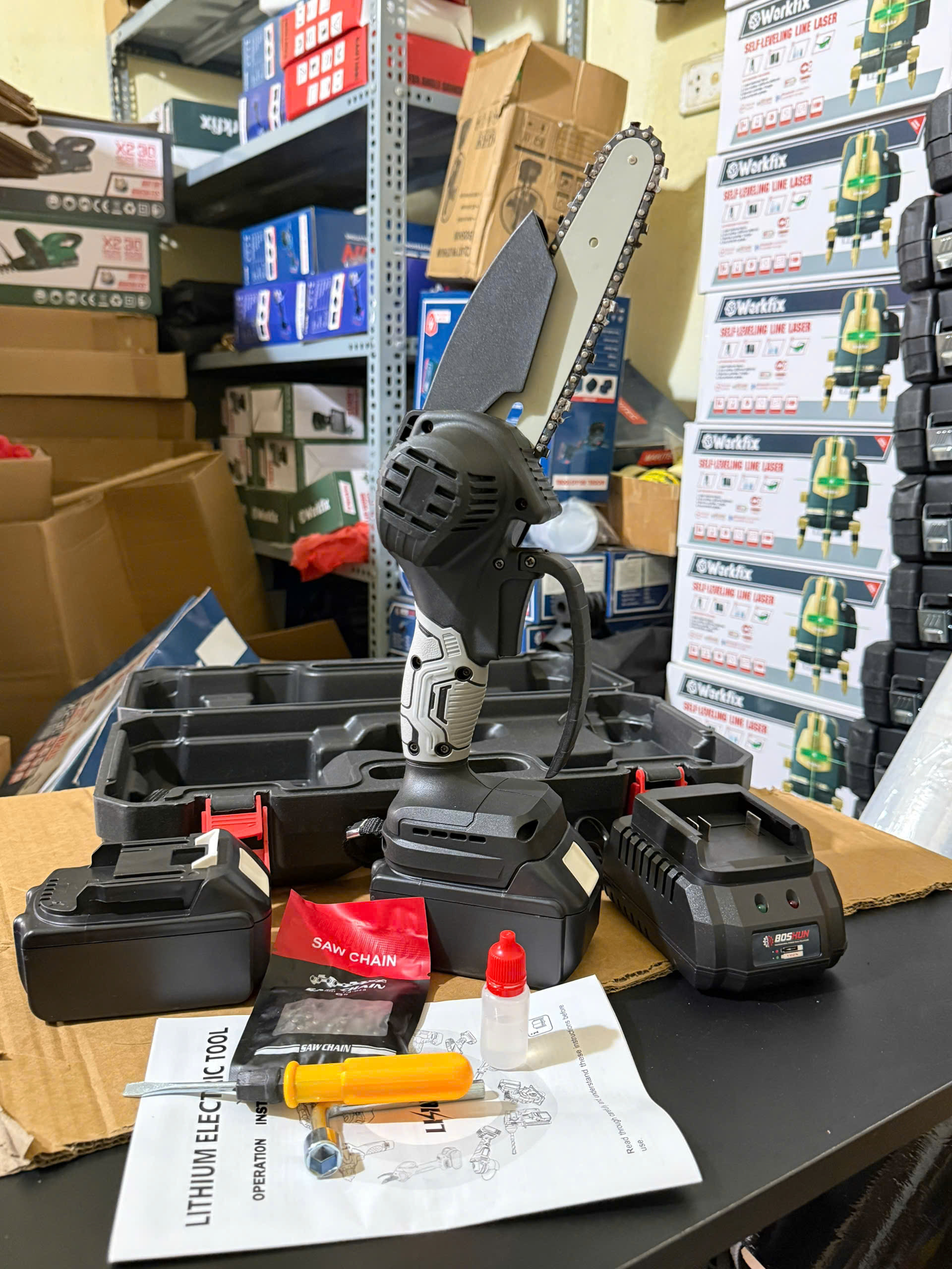 Máy Cưa Xích Workfix CS08BL, Máy Cưa Xích Cầm Tay Mini Lam Xích Dài 24cm, Lõi Đồng 100%, Pin 15 Cell