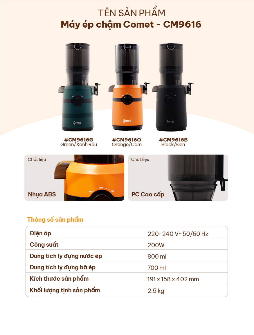 Sở hữu dấu ấn tinh giản kết hợp cùng sự tiện lợi, Máy ép chậm Comet mang lại giải pháp tối ưu, giúp nâng cao chất lượng cuộc sống và là mảnh ghép hoàn mỹ cho mọi căn bếp hiện đại: