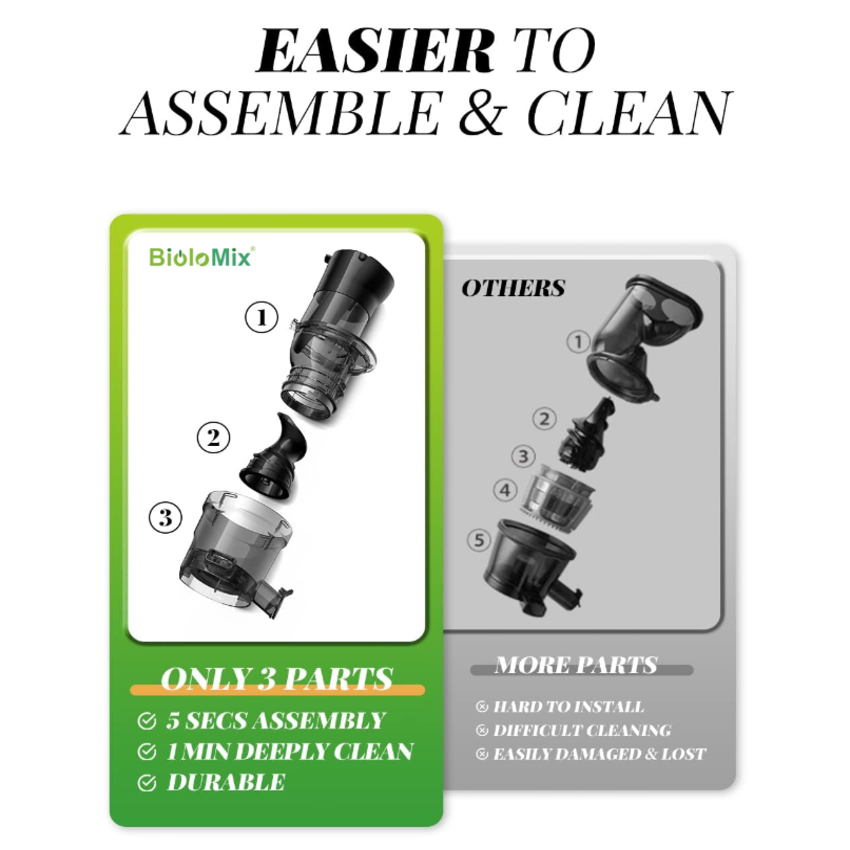 - Mỗi bộ phận riêng biệt của máy ép trái cây chậm đều thân thiện với máy rửa chén để làm sạch nhanh chóng. Khóa an toàn một chạm cho phép bạn tháo rời các bộ phận trong vài giây và rửa sạch trực tiếp.