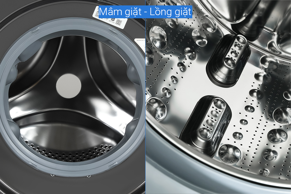 - Lồng giặt làm bằng thép không gỉ cứng cáp, bóng sáng, hạn chế gỉ sét, ít bám bẩn, hỗ trợ bạn vệ sinh dễ dàng. Bên cạnh lồng giặt có cần nâng thép không gỉ giúp tăng hiệu suất giặt, chống lại vi khuẩn đến 99%. Khối lượng giặt và chương trình giặt