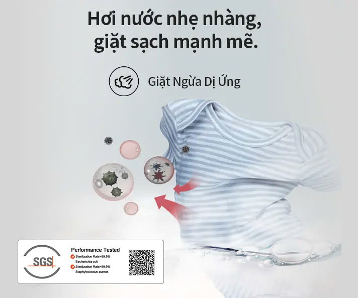 - Hơi nước nhẹ nhàng, giặt sạch mạnh mẽ: chương trình Allergy Steam sử dụng hơi nước ở nhiệt độ cao loại bỏ lên tới 99.9% các tác nhân gây dị ứng và vi khuẩn, đồng thời giữ cho quần áo luôn sạch sẽ và bảo vệ làn da của bạn.