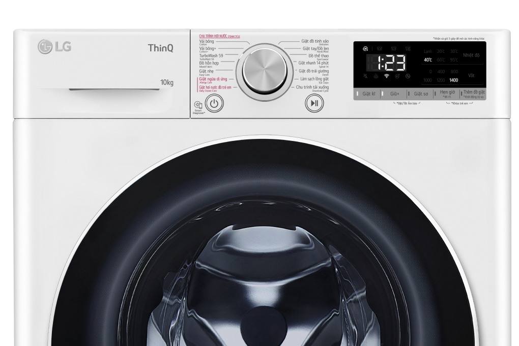 - Trang bị thêm công nghệ Inverter điều khiển động cơ bằng vi xử lý nên trong quá trình sử dụng đảm bảo tiết kiệm điện năng, máy vận hành êm ái. Tiện ích - Chẩn đoán lỗi Smart Diagnosis: giúp người dùng kịp thời phát hiện lỗi có trên máy giặt nhằm đưa ra giải pháp kịp thời. - Khóa trẻ em: khóa phím chức năng trên này giúp quá trình vận hành không bị gián đoạn hoặc trẻ em nghịch phá. - Thêm đồ trong khi giặt: khi máy đang vận hành bạn vẫn có thể dễ dàng cho thêm đồ bị bỏ sót vào mà không mất công bấm tạm ngưng hoặc phải chạy lại chu trình giặt từ đầu. - Vệ sinh lồng giặt: làm hạn chế các vi khuẩn, bụi vải, cặn bẩn có trên máy giặt để hạn chế tình trạng vi khuẩn sinh sôi và tăng tuổi thọ cho máy. - Điều khiển máy giặt từ xa qua ứng dụng LG ThinQ có trên chiếc điện thoại smartphone hiện đại và tiện lợi. Tóm lại đây là một sản phẩm có thiết kế đẹp mắt và được tích hợp đa dạng chương trình giặt cũng như công nghệ nhằm tối ưu quá trình giặt giũ và đảm bảo máy tiết kiệm nước, điện và luôn vận hành êm ái. Nếu nhà bạn có từ 5 – 7 người thì chiếc máy giặt 10 kg này là lựa chọn đáng cân nhắc.