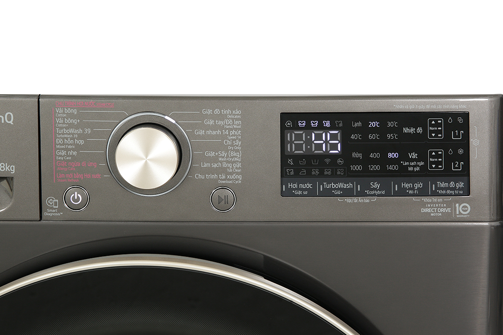 - Máy giặt được tích hợp 14 chương trình giặt tiện lợi, trong đó có các chương trình nổi bật như: + Giặt ngừa dị ứng: Chức năng chính diệt khuẩn, ngăn ngừa các tác nhân gây dị ứng cho da. + Giặt nhanh 14 phút: Hỗ trợ bạn giặt nhanh trong 14 phút, phù hợp với quần áo nhỏ và ít bám bẩn, tiết kiệm thời gian, điện năng và nước hơn so với chu trình thông thường. Công nghệ giặt đặc biệt - Công nghệ AI DD bảo vệ sợi vải: Công nghệ mới với 6 chuyển động mô phỏng các bước giặt bằng tay giúp bảo vệ sợi vải. Tiếp theo cảm biến sẽ nhận diện khối lượng, độ mềm của quần áo và tự động chọn chế độ giặt tối ưu và phù hợp nhất đối với từng loại quần áo, giúp áo quần sạch sâu, thơm tho và sạch khuẩn. - Công nghệ giặt hơi nước Steam: đánh bay 99,9% vi khuẩn, nấm mốc và tác nhân gây dị ứng, góp phần bảo vệ sức khỏe, làn da của cả gia đình, nhất là trẻ nhỏ. Công nghệ Steam trên máy giặt LG được Cố vấn Khoa học về Dị ứng Vương quốc Anh chứng nhận hoàn toàn loại bỏ 99,9% vi khuẩn gây bệnh. Hiệp hội dị ứng Anh quốc Allergy UK là một tổ chức từ thiện hàng đầu về y tế dành cho người bị dị ứng, được thành lập vào năm 1991 với tên gọi Quỹ Dị ứng của Anh (British Allergy Foundation – BAF). Đến năm 2002, tổ chức đổi tên thành Allergy UK. - Công nghệ TurboWash360: Dùng vòi phun 3D áp lực lớn giúp loại bỏ bụi bẩn nhanh hơn và giặt khối lượng quần áo lớn hơn. Nhờ đó có thể giặt và xả tối ưu, giúp tiết kiệm khoảng 1 giờ so với khi giặt thông thường và giảm hao phí điện năng lên đến hơn 15% và nước là hơn 40%. Động cơ – Công nghệ tiết kiệm điện