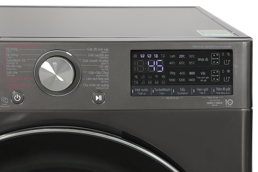 Đặc điểm nổi bật - Khối lượng giặt 10.5 kg thích hợp với gia đình từ 7 thành viên trở lên. - Công nghệ suy luận Fuzzy Logic, tự động suy luận và đưa ra mức nước tương ứng với lượng quần áo cần giặt. - Công nghệ Steam Wash, giặt hơi nước giúp quần áo sạch hơn, có khả năng diệt khuẩn và giảm các tác nhân dị ứng. - Công nghệ giặt nước nóng mang đến khả năng kháng khuẩn, dễ dàng giặt sạch các vết bẩn cứng đầu. - Công nghệ Inverter tiết kiệm điện, nước hiệu quả. - Tổng quan - Loại máy giặt:Cửa trước - Lồng giặt:Lồng ngang - Khối lượng giặt:10.5 Kg - Số người sử dụng:Trên 7 người - Kiểu động cơ:BLDC - Tốc độ quay vắt tối đa:1400 vòng/phút - Chất liệu lồng giặt:Thép không gỉ - Chất liệu vỏ máy:Kim loại sơn tĩnh điện - Chất liệu cửa máy:Kính cường lực Mức tiêu thụ điện