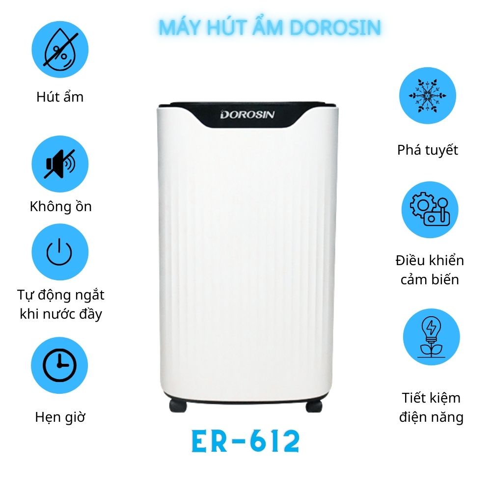 - Đặc điểm nổi bật của máy hút ẩm Dorosin ER-614 Tiết kiệm điện năng Máy hút ẩm Dorosin ER-612 sử dụng máy nén giúp tiết kiệm điện năng và bảo vệ môi trường, với chất làm lạnh R134A. Bộ lọc kháng khuẩn Ngoài chức năng hút ẩm, máy ER-612 có thêm chức năng lọc không khí Ngoài lớp lọc thô, máy còn có kèm theo màng lọc cacbon hoạt tính cao cấp, hấp thụ hầu hết mọi loại mùi và bụi bẩn. Công suất hút ẩm vừa và nhỏ Với công suất hút ẩm 12 lít /24 giờ (ở điều kiện 30oC, 80%), máy ER-612 thích hợp để sử dụng hút ẩm ở những diện tích như văn phòng làm việc, chung cư mini… Các phím điều chỉnh linh hoạt Trên máy hút ẩm ER-612 có các phím điều chỉnh chức năng thuận tiện cho người dùng. Người dùng có thể tùy ý điều chỉnh độ ẩm theo nhu cầu sử dụng. Độ ẩm thích hợp trong không khí khiến chúng ta cảm thấy thoải mái là từ 40 – 70%, thích hợp cho bé và trẻ sơ sinh là 40 – 60%. Tính năng hẹn giờ tự động Máy có trang bị chức năng hẹn giờ giúp bạn đặt giờ làm việc của máy hút ẩm Dorosin ER-612 khi đi ra ngoài hoặc khi sử dụng máy qua đêm. Sản phẩm có đèn báo hiệu dừng làm việc khi bình nước thải đầy, khi đó bạn nhớ mở bình ra và đổ nước thải đi nhé. Độ ồn thấp Độ ồn làm việc của máy hút ẩm Dorosin ER-612 thấp là 41dB giúp bạn tập trung làm việc, nhất là gia đình của trẻ nhỏ thì sản phẩm hoạt động đảm bảo không gây tiếng ồn cho bé khi ngủ. Tính năng phá tuyết Máy hút ẩm Dorosin ER-612 còn có tính năng phá tuyết. Ở dàn lạnh, khi độ ẩm cao quá, đôi khi hơi nước bị đóng tuyết nên trên máy có thiết kế và lắp đặt chức năng tự động phá tuyết. Chức năng hút ẩm đồng thời lọc không khí Ngoài chức năng hút ẩm, máy ER-612 có thêm chức năng lọc không khí và kết nối wifi. Ngoài lớp lọc thô, máy còn có kèm theo màng lọc cacbon hoạt tính khử mùi, khử khuẩn. Các bạn yên tâm vì lớp màng lọc của sản phẩm là màng lọc cao cấp, chất lượng cao nên khả năng hấp thụ hầu hết mọi loại mùi và bụi bẩn.