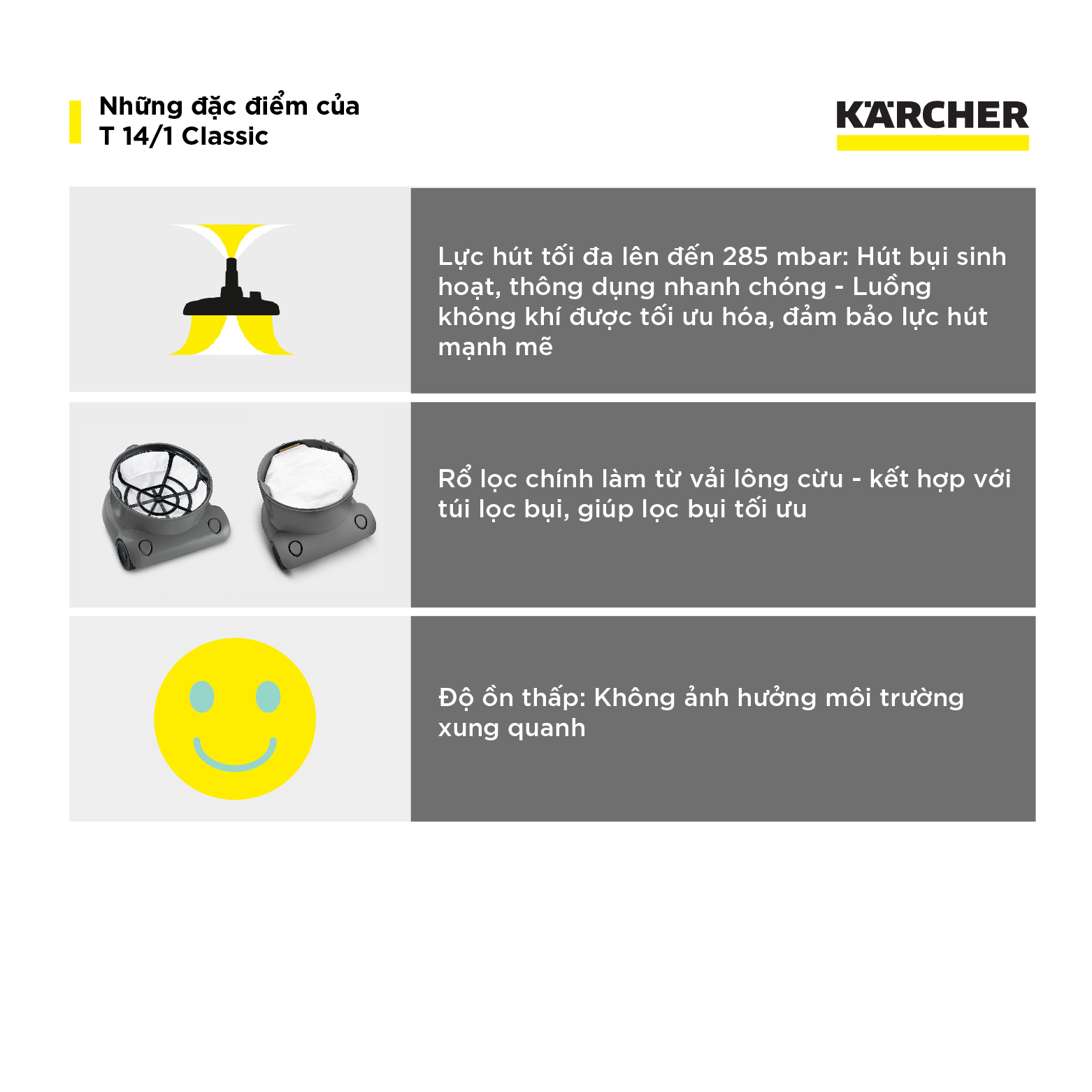 - Máy hút bụi Karcher T 14/1 Classic là lựa chọn lý tưởng cho các công việc vệ sinh công nghiệp nhờ vào tính năng mạnh mẽ và thiết kế tiện lợi.