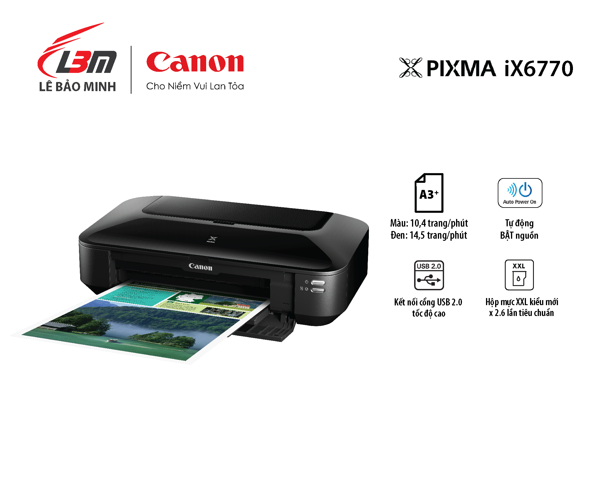 - Lượng bản in khuyến nghị theo tháng: 80 - 200 trang Tính năng Tính năng tự động BẬT nguồn Tính năng tự động BẬT nguồn sẽ dò tìm lệnh in và tự động bật máy in có kết nối USB. Hộp mực riêng biệt kiểu mới Hộp mực XXL kiểu mới có thể in gấp 2,6 lần dung lượng bản in so với các ống mực chuẩn Mẫu giải pháp Bạn có thể tải các mẫu giải pháp được thiết kế riêng (như menu, đề xuất bán hàng và kí hiệu văn phòng khác) cho các mục đích sử dụng riêng biệt với chiếc máy in này thông qua Quick Menu. In tài liệu cỡ A3 Bạn sẽ có lợi thế trong cuộc cạnh tranh kinh doanh. Bởi iX6770 có thể in các bản in khổ rộng có độ phân giải cao và in bản vẽ CAD lên tới khổ A3.