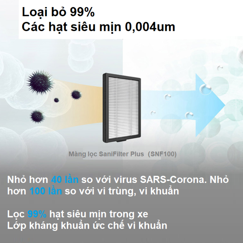 - Tẩm lọc SaniFiler Plus lọc 3 giai đoạn mạnh mẽ độc đáo loại bỏ tới 125 chất gây ô nhiễm có hại và khí thải và các loại virut, thông qua các lớp HEPA và HESA. Được chứng nhận độc lập bởi Airmid Healthgroup, công nghệ SaniFilter Plus cũng loại bỏ tới 99% các hạt bụi siêu mịn và các chất gây dị ứng trong xe. Lọc hiệu quả các hạt nhỏ đến 0,004um, bao gồm các loại vi rút và vi khuẩn tức là nhỏ hơn 40 lần so với Virut SARS-Corona, nhỏ hơn 100 lần so với các loại virut thông thường . Công nghệ lá chắn UVC