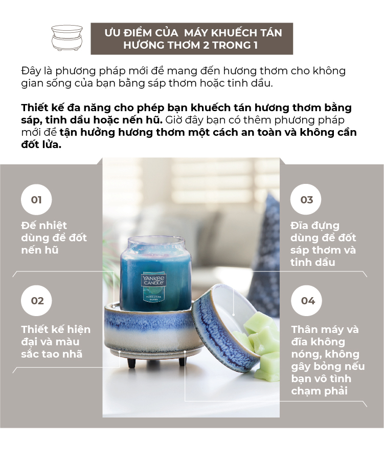 - Vừa làm đốt nến lãng mạn, vừa xông tinh dầu thơm ngát - Khuếch tán mùi thơm, tinh dầu thơm dễ chịu, khử mùi hôi triệt để, đặc biệt hiệu quả với không gian