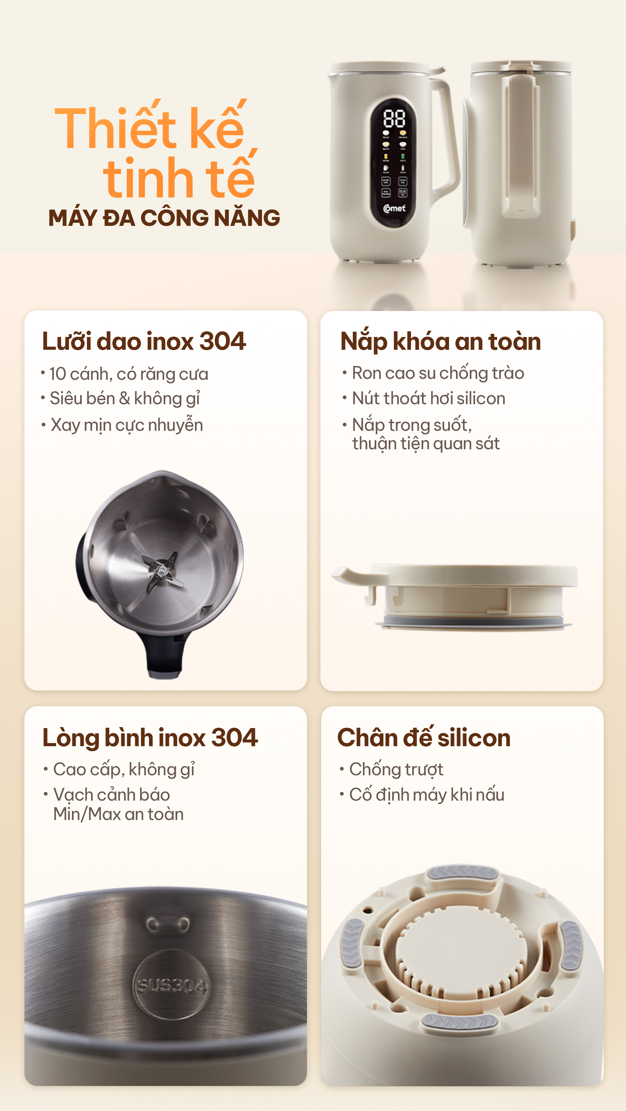 THÔNG SỐ COMET-CM9216 - Công suất nấu (W) 800W - Công suất xay (W) 200W - Dung tích máy 1.2L - Chất liệu cối xay Inox SUS304 - Mô tơ AC, đồng - Điều khiển