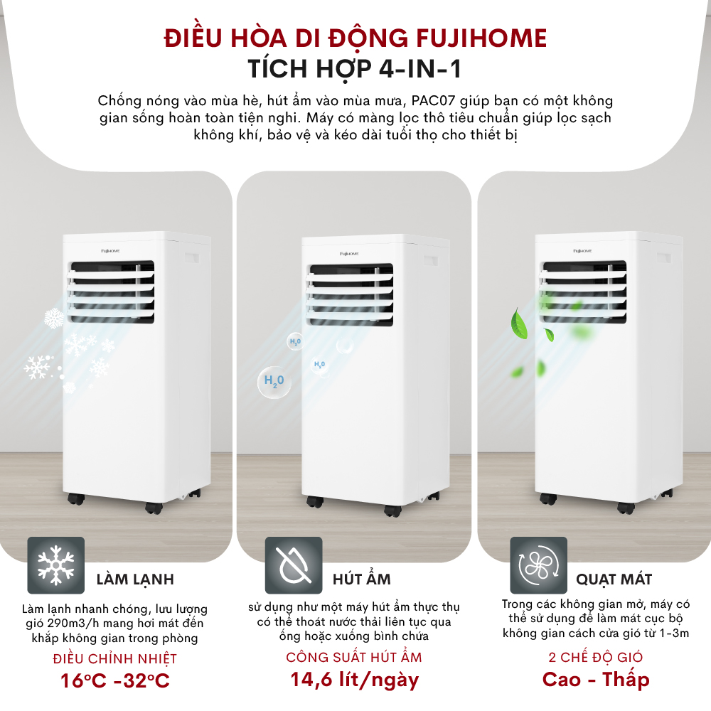 - Công suất làm lạnh công suất 7000BTU, phù hợp sử dụng cho không gian kín diện tích 10 - 15m2. ƯU ĐIỂM VƯỢT TRỘI: Thiết kế thông minh, tính cơ động cao Nhờ thiết kế thông minh 2 bộ phận cục nóng và lạnh trên cùng 1 thiết bị, nên máy điều hòa di động Fujihome PAC07 không cần lắp đặt như các dòng gắn tường thông thường. Thiết kế nhỏ gọn theo phong cách hiện đại, trang nhã, màu trắng thanh lịch đi phù hợp với không gian nội thất của các gia đình trẻ. Máy được trang bị hệ thống 4 bánh xe, giúp di chuyển linh hoạt tới bất kỳ địa điểm nào mà bạn muốn: Từ phòng khách, nhà bếp, phòng làm việc cho tới phòng ngủ. Bảng điều khiển điện tử cảm ứng thông minh, với giao diện trực quan dễ dàng sử dụng cho cả người trẻ và người lớn tuổi. Đa chức năng 4 in 1 Chiếc máy điều hòa di động này của thương hiệu Fujihome sở hữu 4 tính năng trong cùng 1 sản phẩm: