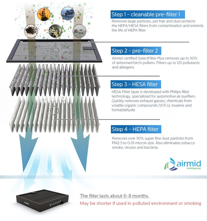 - Sử dụng công nghệ Airmax đời mới nhất của Philips, lọc 3 giai đoạn mạnh mẽ: Bộ lọc không khí xeon GoPure của Philips có hệ thống lọc không khí nhanh và hiệu quả. SelectFilter Plus 3 giai đoạn độc đáo loại bỏ tới 125 chất gây ô nhiễm có hại và khí thải, thông qua các lớp HEPA và HESA. Được chứng nhận độc lập bởi Airmid Healthgroup, công nghệ SelectFilter Plus cũng loại bỏ tới 90% các chất gây dị ứng phấn hoa trong không khí.
