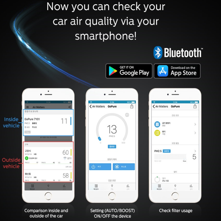 - Vòng màu cung cấp thêm tín hiệu thị giác từ màu xanh (tốt) đến đỏ (kém) để biểu thị chất lượng không khí trong ô tô Điều khiển từ xa thông qua ứng dụng Air Matters