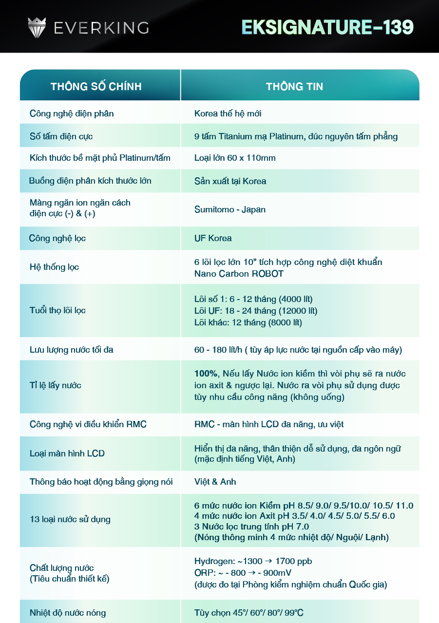 - 3 Nước lọc trung tính pH 7.0 (Nóng thông minh 4 mức nhiệt độ/Nguội/Lạnh) Chất lượng nước đạt chỉ số tối ưu, nồng độ Hydro hoạt tính lên đến ~ 1300 -> 1700 ppb, chống oxy hóa (ORP) lên đến ~ -800 -> -900 mV, chỉ số lý tưởng của máy lọc nước điện giải ion kiềm, được kiểm nghiệm trực tiếp tại Phòng Thí Nghiệm chuyên nghiệp cấp quốc gia. Chỉ số Hydrogen, ORP của nước tùy thuộc số tấm điện cực, đặc tính nguồn nước & “điều kiện đo trong phòng thí nghiệm chuyên nghiệp, đạt chuẩn”. Tích hợp chức năng Nóng – Lạnh đầy tiện ích – Đạt Kỷ Lục Châu Á & Thế Giới – Bản quyền phát minh sáng chế Công nghệ vi điều khiển RMC/LCD tiên tiến, khác biệt vượt trội: Đỉnh cao công nghệ điện phân Korea Hệ thống đa cấp lọc hoàn hảo EVERKING EKSignature-139 được tích hợp công nghệ UF tiên tiến lọc nước trung tính, với hệ thống lọc đa cấp sản xuất Hàn Quốc & công nghệ diệt khuẩn Nano Carbon (ROBOT) vẫn “giữ được các khoáng chất tự nhiên của nước cho quá trình điện phân tạo nước điện giải bền vững 24/24 suốt vòng đời của máy”. Kiểu dáng hiện đại thiết kế thông minh Máy lọc nước ion kiềm EVERKING EKSignature-139 tủ đứng duy nhất thị trường điện giải, thiết kế mới nhất, vô cùng độc đáo – chinh phục mọi không gian như nhà bếp, phòng ăn hay phòng khách, văn phòng, công sở phong cách thanh lị Với sắc màu xanh trắng cẩm thạch chủ đạo, sản phẩm tạo nên cảm giác sang trọng, thư thái và tôn vinh đẳng cấp cho người sử dụng. Giá thành phải chăng cho mọi nhà Nếu so sánh với các sản phẩm nhập khẩu EVERKING EKSignature-139 có chất lượng vượt trội, đạt chuẩn quốc tế, nhưng giá thành siêu tiết kiệm. Đặc biệt, chi phí thay lõi lọc cũng luôn được nhà sản xuất đảm bảo trong mức dưới 2.000.000đ/năm. Kết hợp chế độ bảo hành chính hãng, luôn sẵn có vật tư linh kiện thay thế nhanh chóng với mức phí ưu đãi nhất. CHỨNG NHẬN CHẤT LƯỢNG EVERKING EKSignature-139 đạt các chứng nhận cấp quốc tế, Thiết bị Y Tế & An Toàn Điện Châu Âu CE, đăng ký FDA, xác lập Kỷ Lục Việt Nam, Châu Á & Thế Giới, Đĩa Vàng Sáng Tạo Thế Giới, đăng ký bản quyền sáng chế tại Quốc Tế.