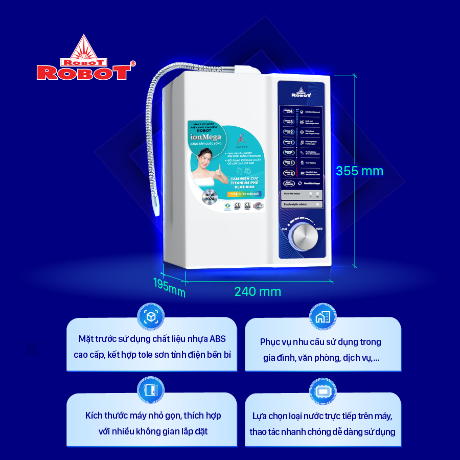 Máy lọc nước điện giải ion kiềm ROBOT ionMega 97 Máy lọc nước điện giải ion kiềm ionMega – thiết kế mới nhất, độc đáo siêu tiết kiệm với đầy đủ công năng của một máy điện giải ion kiềm đạt chuẩn quốc tế. ROBOT ionMega được thiết kế tối giản, nhỏ gọn, thao tác lấy nước trong một lần chạm, đáp ứng nguồn nước điện giải ion kiềm 24/24 tốt cho sức khỏe & sinh hoạt.   Chỉ số Hydrogen, ORP của nước tùy thuộc số tấm điện cực, đặc tính nguồn nước & “điều kiện đo trong phòng thí nghiệm chuyên nghiệp, đạt chuẩn”.