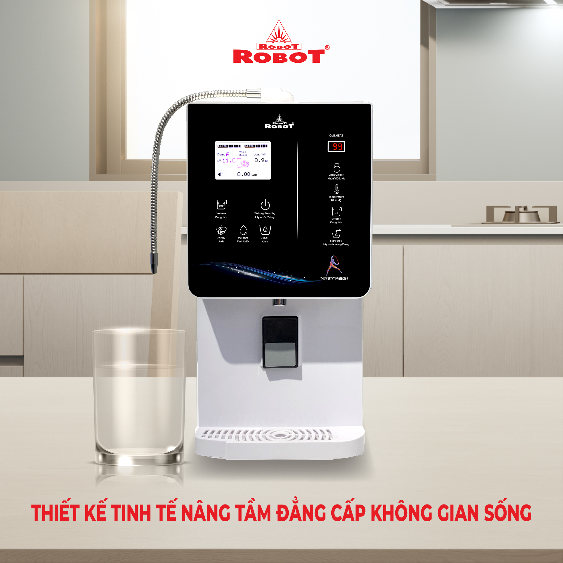 - Và 3 mức nước iON axit (pH 4.5/5.0/5.5). Chất lượng nước đạt chỉ số tối ưu, nồng độ Hydro hoạt tính lên đến ~ 800 -> 950 ppb, chống oxy hóa (ORP) lên đến ~ -400 -> -600 mV, đáp ứng mọi nhu cầu sử dụng trong cuộc sống. Máy lọc nước điện giải iON kiềm Nóng Lạnh ROBOT ionQueen là dòng Để Bàn đầu tiên trên thế giới, được thiết kế kiểu dáng hiện đại, thiết kế chinh phục mọi không gian. Đặc biệt, được tích hợp thêm chức năng Nóng Thông Minh – Lạnh độc đáo & duy nhất trên thị trường, mang lại nhiều tiện ích cho người dùng. Chỉ số Hydrogen, ORP của nước tùy thuộc số tấm điện cực, đặc tính nguồn nước & “điều kiện đo trong phòng thí nghiệm chuyên nghiệp, đạt chuẩn”. Máy lọc nước điện giải iON kiềm Nóng Lạnh ROBOT ionQueen 711, tạo 11 loại nước bổ ích, pH 4.5 ---> 10.5 - Đáp ứng mọi nhu cầu trong cuộc sống Có thể tham khảo ý kiến của Bác sĩ hoặc chuyên gia dinh dưỡng để được hướng dẫn loại nước uống phù hợp nhất cho cơ thể. Kiểu dáng hiện đại - Thiết kế chinh phục mọi không gian ● Kiểu dáng để bàn, khác biệt so với các dòng điện giải khác ● Sử dụng linh hoạt cho mọi không gian ● Vòi nước điện giải xoay 360° ● Hệ thống điều khiển cảm ứng trên mặt phủ kính với màn hình LCD tinh tế Với mong muốn nhiều gia đình Việt có thể sử dụng nước điện giải iON kiềm với chi phí hợp lý để bảo vệ sức khỏe, sắc đẹp & nâng cao chất lượng cuộc sống, ROBOT mang đến sản phẩm “Chất lượng Quốc tế - Giá thành Việt Nam”, phù hợp với mức sống của nhiều người. Tiết kiệm cho người tiêu dùng đến hơn một nửa chí phí so với máy nhập khẩu chỉ từ 30 – 50%, nhưng sở hữu nhiều ưu điểm, tính năng vượt trội, chất lượng cao. Chế độ bảo hành chính hãng, tận nơi, vật tư và linh kiện, lõi lọc luôn có sẵn hạn chế tối đa chi phí sửa chữa, bảo trì. VĐV Cầu Lông Nguyễn Tiến Minh – tay vợt từng đứng Top 5 Thế Giới chia sẻ: Sau một thời gian sử dụng Máy lọc nước điện giải iON kiềm Minh thấy cải thiện sức khỏe rất nhiều và tốc độ hồi phục sau tập luyện, thi đấu cũng nhanh hơn so với trước đây. Bây giờ mỗi khi đi tập, hay khi đi thi đấu, Minh đều mang theo nước iON kiềm để uống. ROBOT là một thương hiệu Việt Nam uy tín nên Minh hoàn toàn tin tưởng và lựa chọn Máy lọc nước điện giải iON kiềm ROBOT. ️Thông Tin Thương Hiệu CÔNG TY CỔ PHẦN ĐẦU TƯ ROBOT
