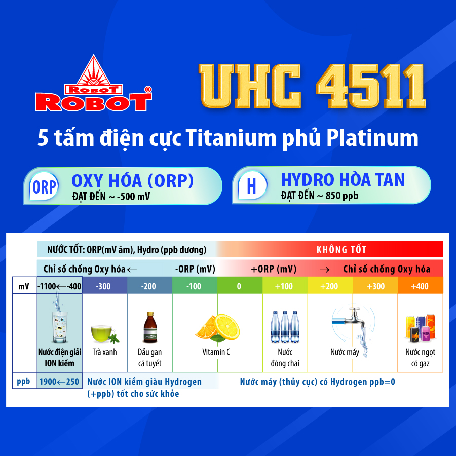 MÁY LỌC NƯỚC ĐIỆN GIẢI ION KIỀM – NÓNG – LẠNH UHC 4511 MÁY LỌC NƯỚC ĐIỆN GIẢI ROBOT CÓ GÌ ĐẶC BIỆT HƠN SẢN PHẨM KHÁC?   I/ Tạo 11 loại nước bổ ích, Hydrogen & ORP vượt trội lên đến 850 ppb & -500 mV Máy lọc nước điện giải iON kiềm ROBOT UHC 4511 là model đặc biệt sản xuất với công nghệ tiên tiến hàng đầu thế giới, trang bị 5 tấm điện cực lớn nhất, có khả năng tạo ra đến 11 loại nước đa chức năng, với 5 mức nước iON kiềm (pH 8.5 - 10.5), nước lọc trung tính - Nóng - Lạnh (pH 7.0) & 3 mức nước iON axit (pH 4.5 - 5.5), có thể điều chỉnh, thay đổi tùy theo đặc tính nguồn nước tại nơi lắp đặt. Với nồng độ Hydro hoạt tính lên đến ~ 750 -> 850 ppb, chống oxy hóa (ORP) lên đến ~ -350 -> -500 mV, đáp ứng mọi nhu cầu sử dụng trong cuộc sống. Chỉ số Hydro, ORP của sản phẩm được kiểm nghiệm trực tiếp tại Phòng Thí Nghiệm chuyên nghiệp cấp quốc gia.   Máy lọc nước điện giải ion kiềm UHC để bàn kiểu dáng tinh tế - đầu tiên đáp ứng nhu cầu sử dụng nước điện giải ion kiềm – nóng – lạnh, chính thức xác lập Kỷ lục Việt Nam & Châu Á   Chỉ số pH, Hydrogen, ORP của nước tùy thuộc số tấm điện cực, đặc tính nước nguồn & điều kiện đo Công dụng tuyệt vời của nước điện giải ion kiềm – bí quyết trường thọ của người Nhật     Có thể tham khảo ý kiến của Bác sĩ hoặc chuyên gia dinh dưỡng để được hướng dẫn loại nước uống phù hợp nhất cho cơ thể. II. Công nghệ độc quyền RMC/LCD & bộ điện phân Korea 5 tấm điện cực Titanium phủ Platinum nguyên khối.
