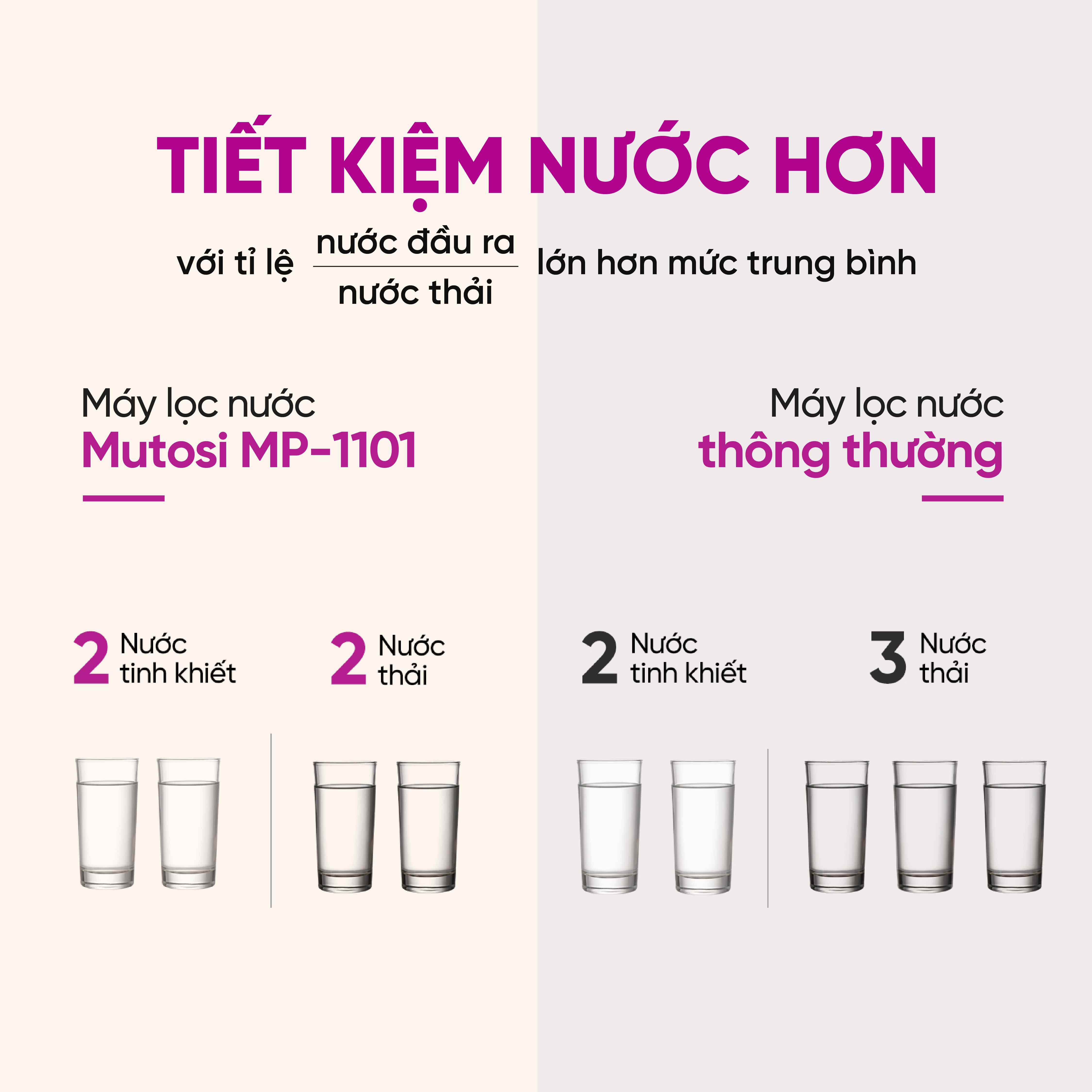- Tiện lợi và tiết kiệm chi phí sinh hoạt: thay vì sử dụng nước đóng chai hay nước đun sôi lại, nguồn nước sạch được lọc, làm nóng trực tiếp (nếu có) từ máy sẽ an toàn, nhanh chóng và tiện lợi hơn. Nước sau lọc có thể uống trực tiếp tại vòi, không cần đun sôi. Máy lọc nước RO Mutosi MP-1101 với hệ thống 11 lõi lọc giúp nước được lọc sạch hiệu quả, ngoài ra còn có màng RO 75 GPD sản xuất tại Hàn Quốc đảm bảo chất lượng, hoạt động với công suất 15 lít/giờ đáp ứng nhu cầu dùng nước sạch cho cả ngày dài,...