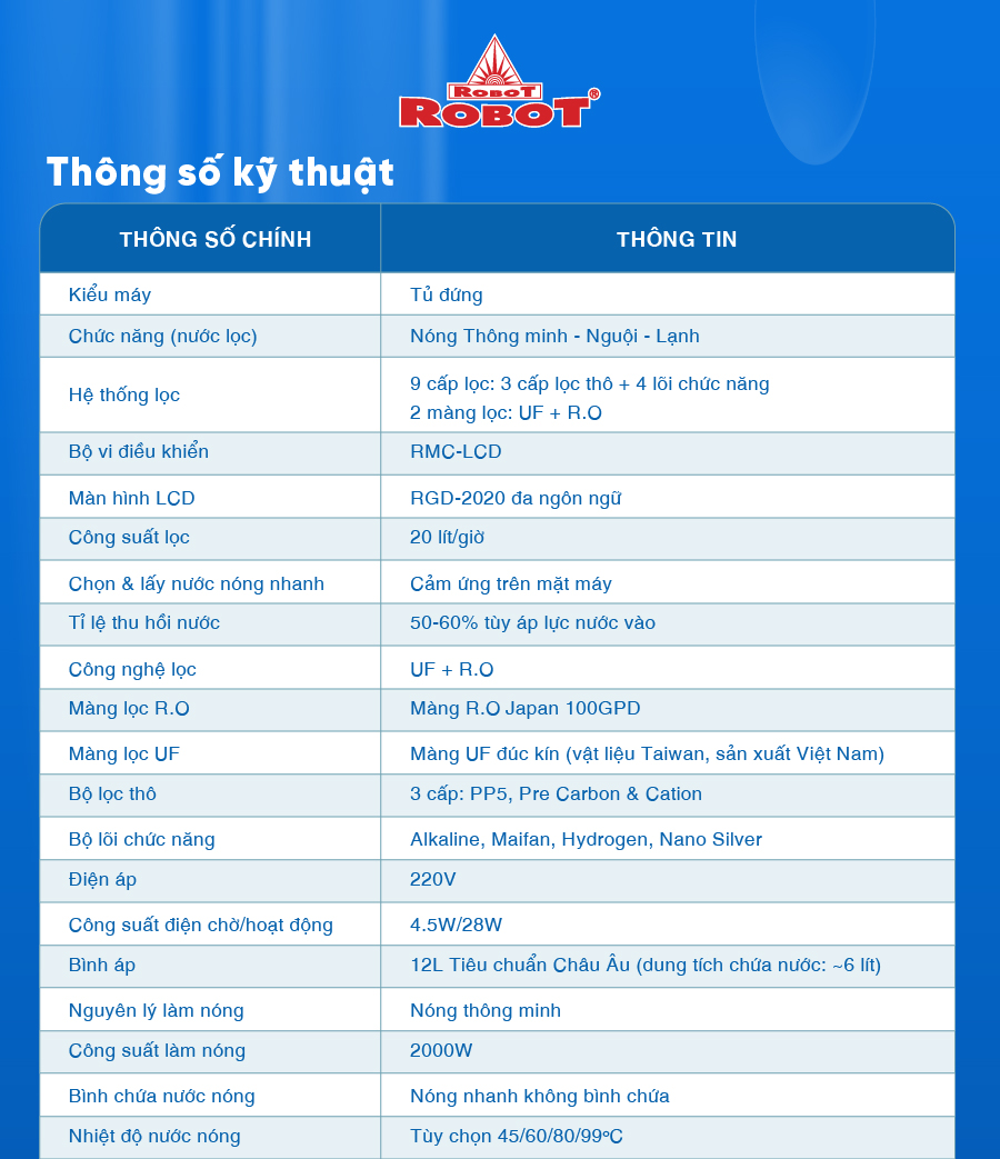 - Đặc biệt, được trang bị thêm vi điều khiển RMC-LCD thiết kế phát minh mới nhất của ROBOT, mở ra nhiều chức năng tiện ích, loại trừ mọi rủi ro khi sử dụng. Công nghệ đã được xác lập Kỷ Lục Việt Nam, Kỷ Lục Châu Á & Đĩa Vàng Sáng Tạo Thế Giới. Công nghệ “Bảo vệ 3 tầng” duy nhất từ ROBOT cung cấp nguồn nước sạch bảo vệ sức khỏe gia đình