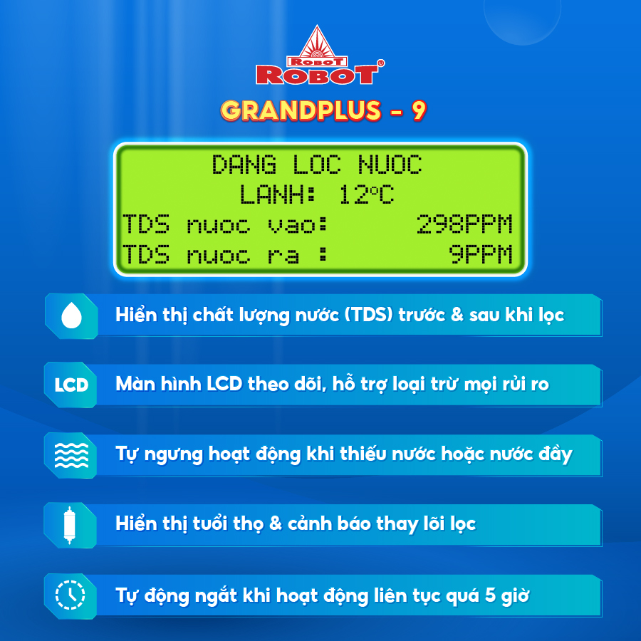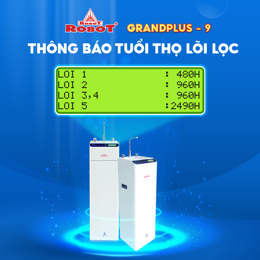 - Chăm sóc nguồn nước với công nghệ “Bảo vệ 3 tầng” UF + RO - RMC/LCD từ ROBOT Máy lọc nước Nóng thông minh – Nguội – Lạnh ROBOT GrandPlus-9 được tích hợp công nghệ “Bảo vệ 3 tầng” gồm 2 màng lọc UF + R.O & vi điều khiển RMC/LCD, đảm bảo nguồn nước lọc tối ưu cho gia đình: