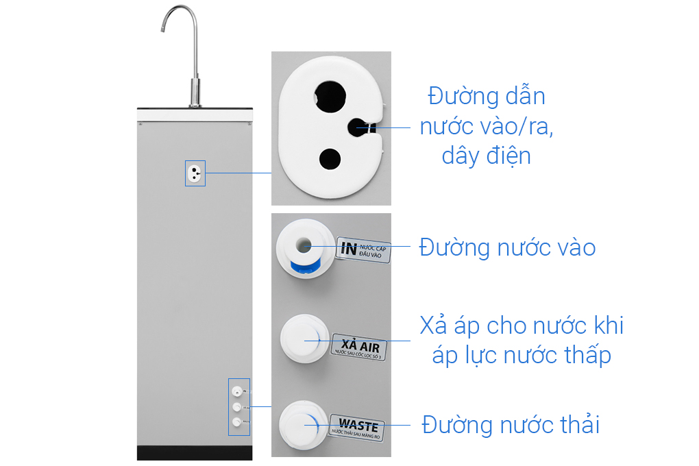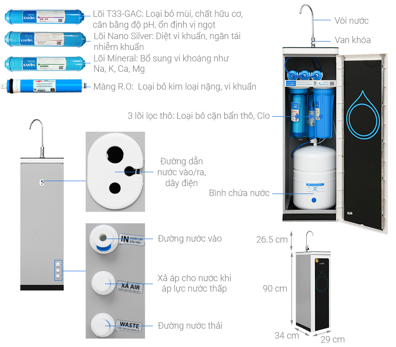 Tổng quan - Kiểu lắp đặt:Tủ đứng - Loại máy:Máy lọc nước RO nóng nguội lạnh - Công nghệ lọc:Thẩm thấu ngược RO - Kháng khuẩn:Nano Silver - Dung tích bình chứa:Tổng 7.8 lít (Nước nóng 0.8 lít, nước lạnh 1 lít, nước thường 6 lít) - Tỷ lệ lọc - thải:Lọc 4.8 - Thải 5.2 (Tỷ lệ này phụ thuộc vào chất lượng nước đầu vào) - Công suất lọc:18 lít/giờ - Công suất tiêu thụ điện trung bình khoảng:0.628 kW/h - Nhiệt độ nước hãng công bố:Nóng 80 - 90°C, Lạnh 10°C - Nhiệt độ nước thực tế:Nóng 80 - 90°C, Lạnh 10°C - Áp lực nước yêu cầu:0.07 - 0.25 MPa - Nơi sản xuất máy bơm:Trung Quốc - Năm ra mắt:2023 - Thương hiệu:Việt Nam - Nơi sản xuất:Việt Nam Thông tin lõi lọc - Số lõi lọc:10 lõi -