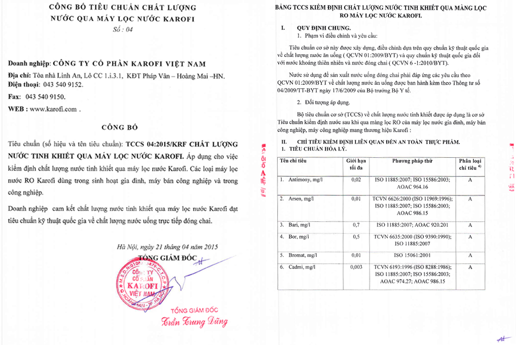 Đạt chuẩn Quốc gia nước uống trực tiếp QCVN6-1:2010/BYT Vượt qua mọi quy trình kiểm tra nghiêm ngặt về chất lượng nước sau lọc và chất lượng dùng trong sinh hoạt gia đình, Karofi là đơn