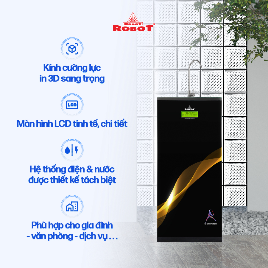 - Các sản phẩm máy lọc nước ROBOT đều sở hữu màn hình LCD sắc nét, hiển thị chi tiết các thông số TDS – chất lượng nước trước & sau lọc, tuổi thọ lõi lọc 24/24… để mọi người đều dễ dàng theo dõi hoạt động máy, chất lượng nước uống thông qua màn hình LCD, loại trừ mọi rủi ro, mang đến sự an toàn tuyệt đối khi sử dụng. 3. Kiểu dáng tinh tế, đa chức năng, tiện lợi