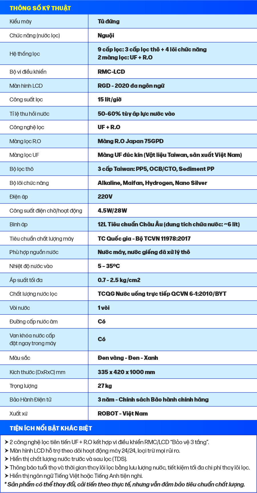Tổng quan - Kiểu lắp đặt:Tủ đứng - Loại máy:Máy lọc nước RO nóng nguội lạnh - Công nghệ lọc:Thẩm thấu ngược RO - Kháng khuẩn:Nano Silver - Dung tích bình chứa:Tổng 7.8 lít (Nước nóng 0.8 lít, nước lạnh 1 lít, nước thường 6 lít) - Tỷ lệ lọc - thải:Lọc 4.8 - Thải 5.2 (Tỷ lệ này phụ thuộc vào chất lượng nước đầu vào) - Công suất lọc:18 lít/giờ - Công suất tiêu thụ điện trung bình khoảng:0.628 kW/h - Nhiệt độ nước hãng công bố:Nóng 80 - 90°C, Lạnh 10°C - Nhiệt độ nước thực tế:Nóng 80 - 90°C, Lạnh 10°C - Áp lực nước yêu cầu:0.07 - 0.25 MPa - Nơi sản xuất máy bơm:Trung Quốc - Năm ra mắt:2023 - Thương hiệu:Việt Nam - Nơi sản xuất:Việt Nam Thông tin lõi lọc - Số lõi lọc:10 lõi -