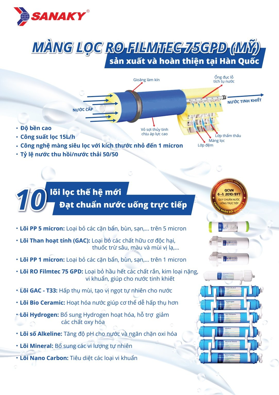 • Là dòng sản phẩm tâm huyết của Sanaky được sản xuất theo kim chỉ nam – Nâng cao chất lượng cuộc sống cho người Việt, Máy lọc nước Sanaky VH-6210VD3 được ra mắt vào tháng 4 này chính là “Món quà dành cho sức khỏe” của SANAKY đem đến cho người tiêu dùng nguồn nước sạch tinh túy nhất.   10 lõi lọc nước thế hệ mới – đạt chuẩn tiêu chuẩn nước uống trực tiếp của Bộ Y tế.   Hệ thống lọc 10 lõi giúp Máy lọc nước Sanaky VH-6210VD3 hoạt động với công suất lớn bổ sung khoáng chất làm ngọt nước và diệt khuẩn lên tới 99,99% có thể uống được trực tiếp Lõi số 1: PP 5 micron (Sediment Filter) Lõi được làm bằng sợi PP, khe lọc 5 micron lọc toàn bộ cặn bẩn, bùn đất, hạt sạn có kích thước > 5micron giúp lọc nhanh, giảm nguy cơ tắc lõi lọc Lõi số 2: Than hoạt tính G.A.C (Granular Activated Cacbon) Cấu tạo lõi là than hoạt tính dạng hạt, hấp thu các chất hữu cơ độc hại như thuốc trừ sâu, chlorine, tạp nhất có màu mùi lạ Lõi số 3: Nano Carbon Cấu tạo than hoạt tính kết hợp với Nano bạc tác dụng diệt và chống tái nhiễm khuẩn cho nước làm nước có vị ngọt tự nhiên. Lõi số 4: PP 1 micron (Sediment Filter) Lõi làm bằng sợi PP khe lọc 1 micron loại bộ toàn bộ các tạp chất có kích thước > 1 micron ngăn chặn sự sinh sôi của các loại vi khuẩn, nguồn nước sau lọc hoàn toàn không màu không mùi. Lõi số 5: RO (Reverse Osmosis Element): Lõi lọc RO Filmtec 75GPD (xuất xứ Mỹ) được sản xuất và hoàn thiện tại Hàn Quốc Lõi số 6: (Mineral Stone) Lõi lọc khoáng đá có chứa khoáng chất cần thiết cho cơ thể như: kẽm, canxi, kali, magie,…Nước sau khi lọc và khử mùi sẽ đi qua lõi lọc này bào mòn các hạt có trong lõi. Sau đó mang theo khoáng chất cũng như các chất điện giải cung cấp thiết yếu cho cơ thể con người. Lõi số 7: (Alkeline) sử dụng chất liệu đá hiếm từ thiên nhiên và được cấu tạo từ các hạt ORP giúp tăng độ pH cho nước và ngăn chặn oxi hóa. Lõi alkaline tách các phân tử nước nhỏ hơn làm tăng độ hoạt tính của nước, tạo tính kiềm giúp trung hòa axit và bổ sung khoáng chất có lợi cho cơ thể. Lõi số 8: (Bio Ceramic) Gồm các hạt gốm phát tia hồng ngoại bước sóng dài làm cho nước dễ phân cực giúp cơ thể dễ hấp thu hơn Lõi số 9: (Hydrogen): Là một trong những lõi lọc được nâng cấp cao cấp nhất hiện nay, Lõi lọc Hydrogen bổ sung chất điện giải Mg2+ cân bằng điện tích cho cơ thể, tạo Hydrogen hoạt tính giúp loại bỏ các tác nhân oxy hóa làm giảm căng thẳng mệt mỏi Lõi số 10: (T33 G.A.C): Hấp thu mùi trong nước tạo vị ngọt, bù một phần khoáng chất tự nhiên cho nước đã lọc Màng lọc RO Filmtec 75GPD (xuất xứ Mỹ) được sản xuất tại Hàn Quốc   Màng lọc RO được coi là trái tim của máy lọc nước RO. Màng lọc RO Filmtec là công nghệ lọc hiện đại nhất tính đến hiện nay. Công nghệ này được sử dụng trong công nghệ lọc nước siêu tinh khiết có thể lọc nước biển thành nước ngọt, được ứng dụng rộng rãi trong công nghệ lọc nước tinh khiết đóng chai, nước dùng cho y tế, dược phẩm, dùng cho công nghệ chế biến thực phẩm và điện tử… Lõi lọc RO Filmtec của Sanaky sử dụng trong máy lọc nước Sanaky VH-6210VD3 được cấu tạo khe lọc 0.0001 micrometer, loại bỏ toàn bộ tạp chất trong nước như Asen, Chì, Canxi, Mangan, Vi khuẩn, Ampi, tạo ra nước tinh khiết đạt tiêu chuẩn nước uống trực tiếp QCVN 6-1:2010/BYT của Bộ Y tế 2 vòi – 3 chế độ nước Nóng – Lạnh – Nguội tiện lợi   Máy lọc nước nóng lạnh Sanaky VH-6210VD3 nổi bật với 2 vòi 3 chế độ nước nóng – nguội – lạnh mang đến sự tiện lợi, đáp ứng mọi nhu cầu sử dụng nước của người dùng. Nhiệt độ nước nóng đến 95 độ C, người dùng có thể thoải mái sử dụng với nhiều mục đích như pha trà, sữa, cafe, mì gói… Nhiệt độ nước lạnh 8-12 độ C mát lành giúp đã khát cho những ngày hè nóng bức Công nghệ máy nén Inverter làm lạnh đầu tiên ở Máy lọc nước tại Việt Nam   Máy nén Inverter làm lạnh tại Việt Nam thường được sử dụng trong làm lạnh nước công nghiệp, phục vụ dây truyền sản xuất,…do đặc tính tiết kiệm điện cao. Thấu hiểu nhu cầu của người tiêu dùng trong thời kỳ giá điện bắt đầu tăng cao, Sanaky đã nghiên cứu và cho ra mắt máy lọc nước VH-6210VD3 có tích hợp công nghệ máy nén Inverter để làm lạnh và duy trì dòng nước với nhiệt độ từ 8-12 độ C mà vẫn tiết kiệm điện. Bước đột phá Công nghệ máy nén Inverter làm lạnh đầu tiên tại Việt Nam giúp làm lạnh nhanh, tiết kiệm điện năng lên tới 30% so với các dòng máy lọc nước thông thường khác. Kết hợp Gas R600a được sử dụng cho máy làm nén là loại Gas lành tính, an toàn cho sức khỏe người tiêu dùng và môi trường. Thiết kế sang trọng   Mặt kính nóc, Cánh kính cường lực chắc chắn chống mọi va đập Mặt kính và cánh tủ được làm bằng kính cường lực chắc chắn giúp chống xước, chống va đập khi vận ch