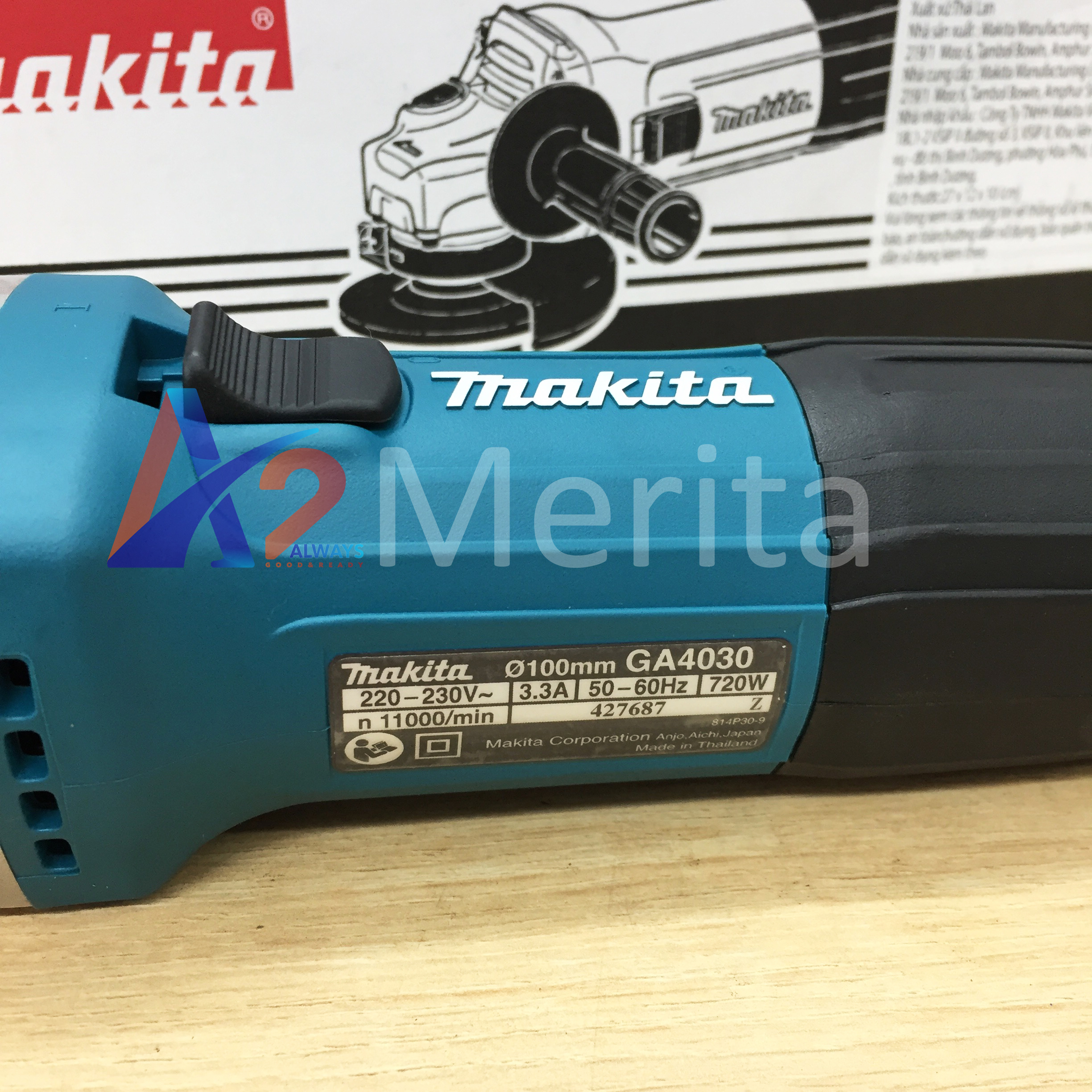 - Model máy: GA4031 - Công suất : 720W - Tốc độ không tải: 11000 vòng/phút - Trọng lượng: 1.6kg - Hãng sản xuất Makita - Đường kính đĩa: 100mm - Công tắc đuôi