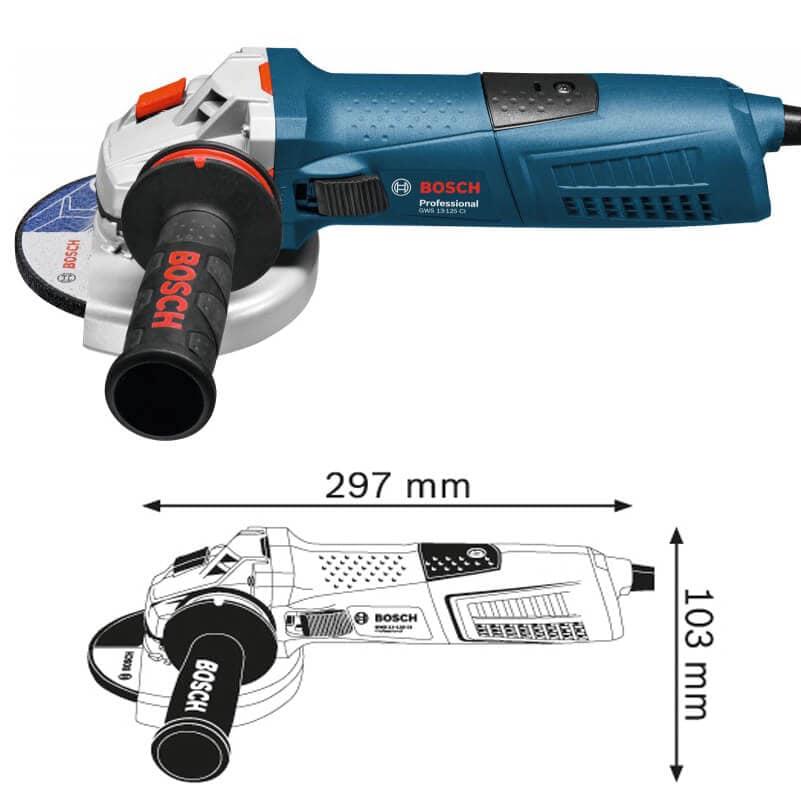Thông số kỹ thuật: -Mã hàng: GWS 13-125 CI -Loại máy Dùng điện -Đầu vào công suất định mức 1,300 W -Tốc độ không tải 11500 vòng/phút -Đầu ra công suất 700 W -Ren trục bánh mài M 14 -Đường kính đĩa 125 mm -Tấm lót cao su, đường kính 125 mm -Chổi nắp con sợi thép, đường kính 75 mm -Chiều dài 297 mm -Chiều cao 103 mm -Trọng lượng 2.3 kg -Công tắc 2 chiều -Mài bề mặt (gia công) –Giá trị phát tán dao động ah 6 m/s² –K bất định 1.5 m/s² -Chà bằng giấy nhám –Giá trị phát tán dao động ah 2 m/s² –K bất định 1.5 m/s -Thương hiệu Đức -Sản xuất tại Trung Quốc